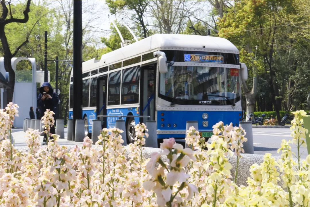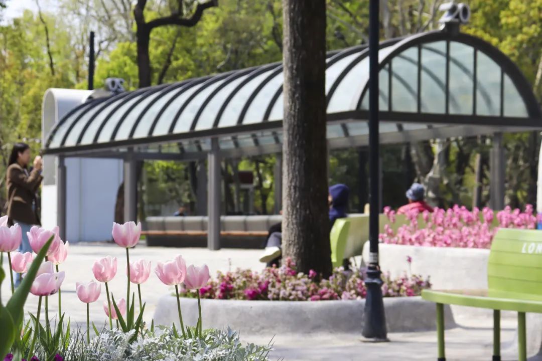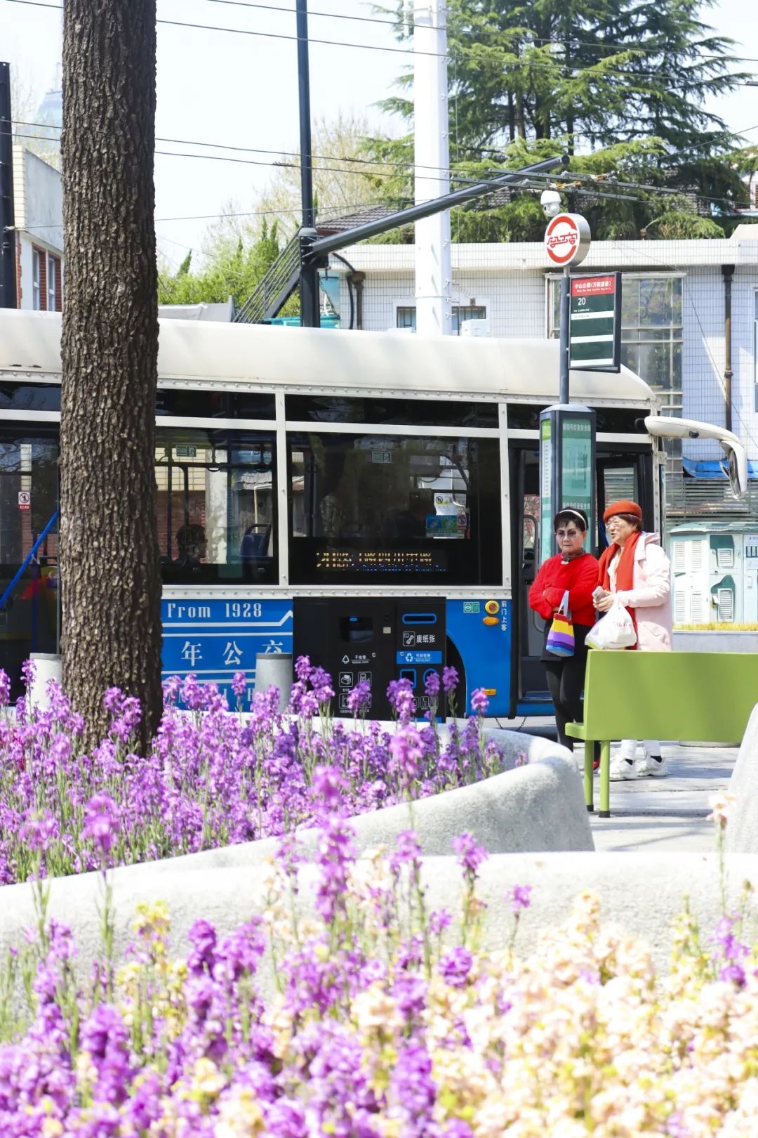 20路中山公园万航渡路公交站位于中山公园2号门,背靠公园的种子池,边上栽种着五颜六色的紫罗兰,它们簇拥绽放,还点缀着娇艳的郁金香,在片片花海的映衬下,车站看起来更有生机和活力,也更有春日氛围感。