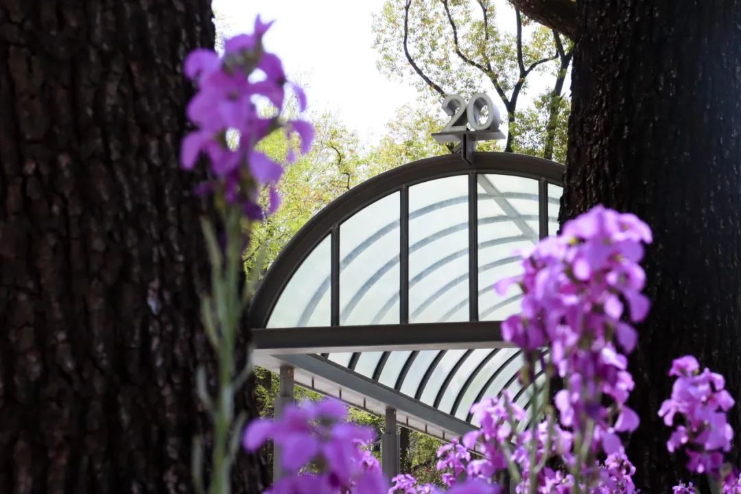 在春暖花开的季节,20路中山公园万航渡路公交站被高大茂盛的树木和缤纷盛放的鲜花环绕,风景格外迷人,吸引了不少候车和游园市民驻足赏景、拍照打卡。