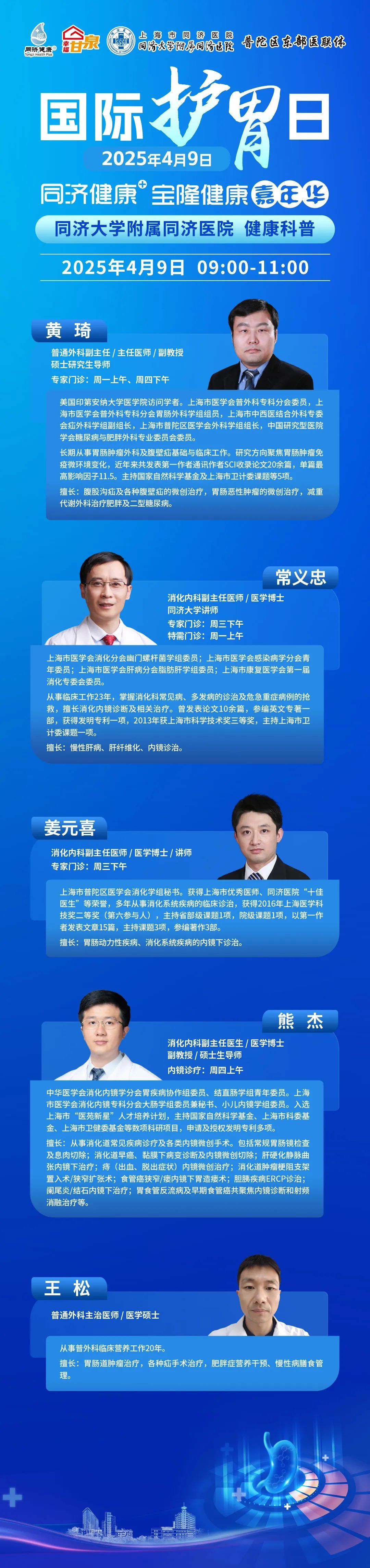 同济大学附属同济医院在2025年4月9日上午9:00进行【国际护胃日】科普直播。来自普通外科,消化内科的5位专家将带来健康科普,呼吁每个人从一餐一饭开始,践行健康习惯,同时关注社会弱势群体的消化健康问题。让我们共同守护“胃”来,为健康生活注入更多温暖与关怀!