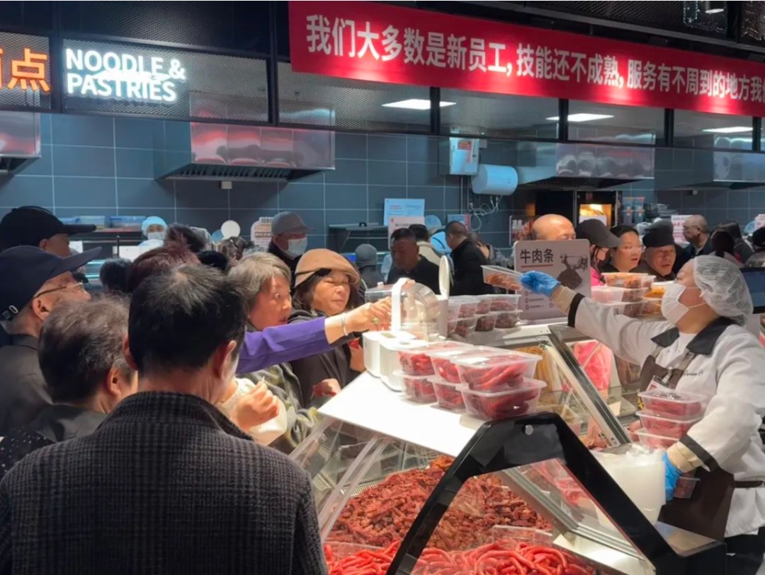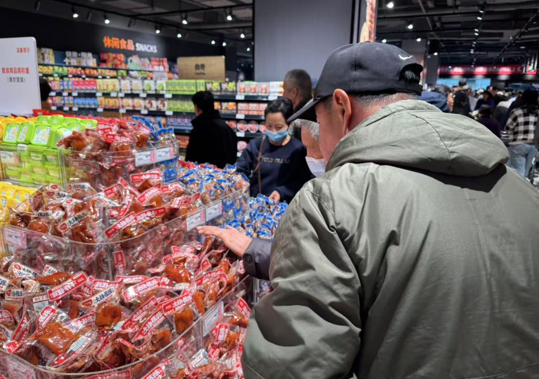 记者注意到,顾客们被细节打动。调味品区增设放大镜方便老年客群,散装糖果标注“每斤约30颗”解决选择焦虑,果切盒按甜度标注食用顺序,海鲜柜台提供清洗、打氧服务,肉禽柜台免费提供切丝、绞肉等服务。店内还设置了试穿拖鞋的专用鞋套、剖鱼间、易碎品打包处以及海鲜打包加冰处……体验了一圈下来,90后顾客张先生不禁感慨:“这些细节很贴心,尤其是设置了宠物柜,让不少带着宠物的主人有地方寄存,这样他们的购物体验也更安心。”