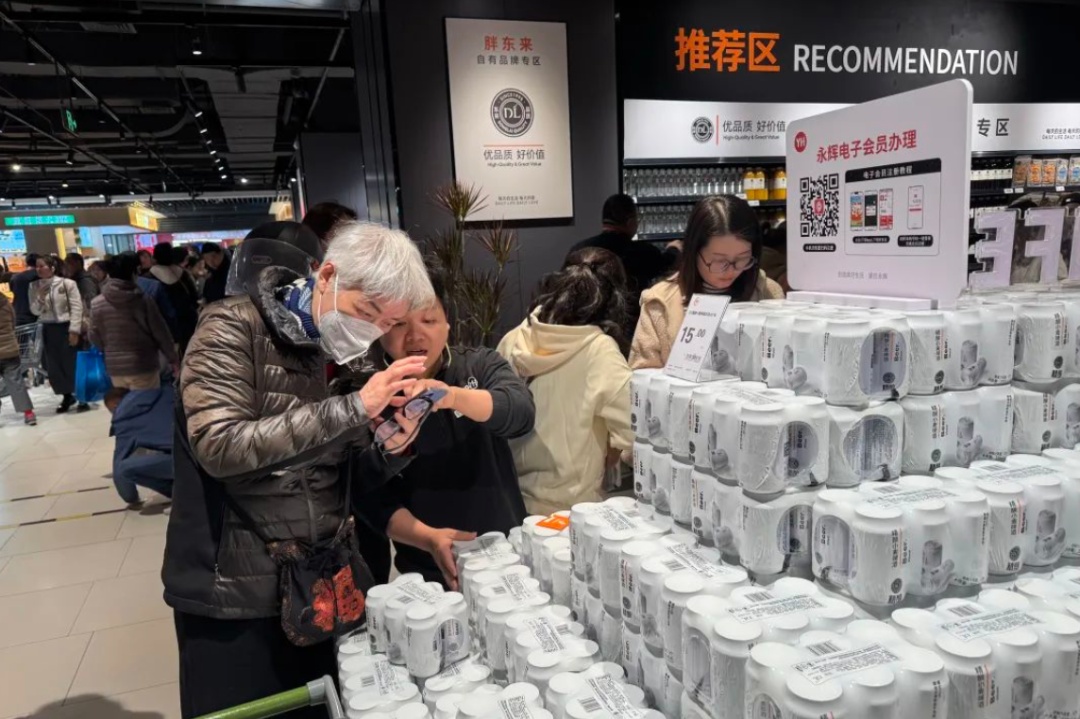 专区的精酿小麦啤酒货架前,一位头发花白的阿姨在店员帮助下注册了永辉会员,兴致勃勃地买了两扎啤酒。“之前不知道胖东来这个品牌,第一天开业,我来随便逛逛,看好多年轻人都在买,我也尝尝鲜!”