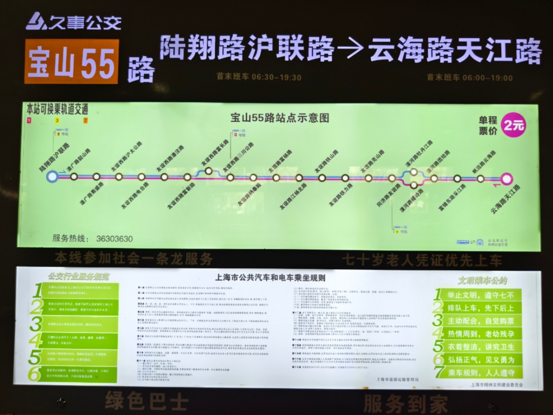 宝山55路公交车的起讫站点为:云海路、天江路站和陆翔路、沪联路站,首末班车时间为:云海路、天江路站06:00至19:00,陆翔路、沪联路站06:30-19:30。