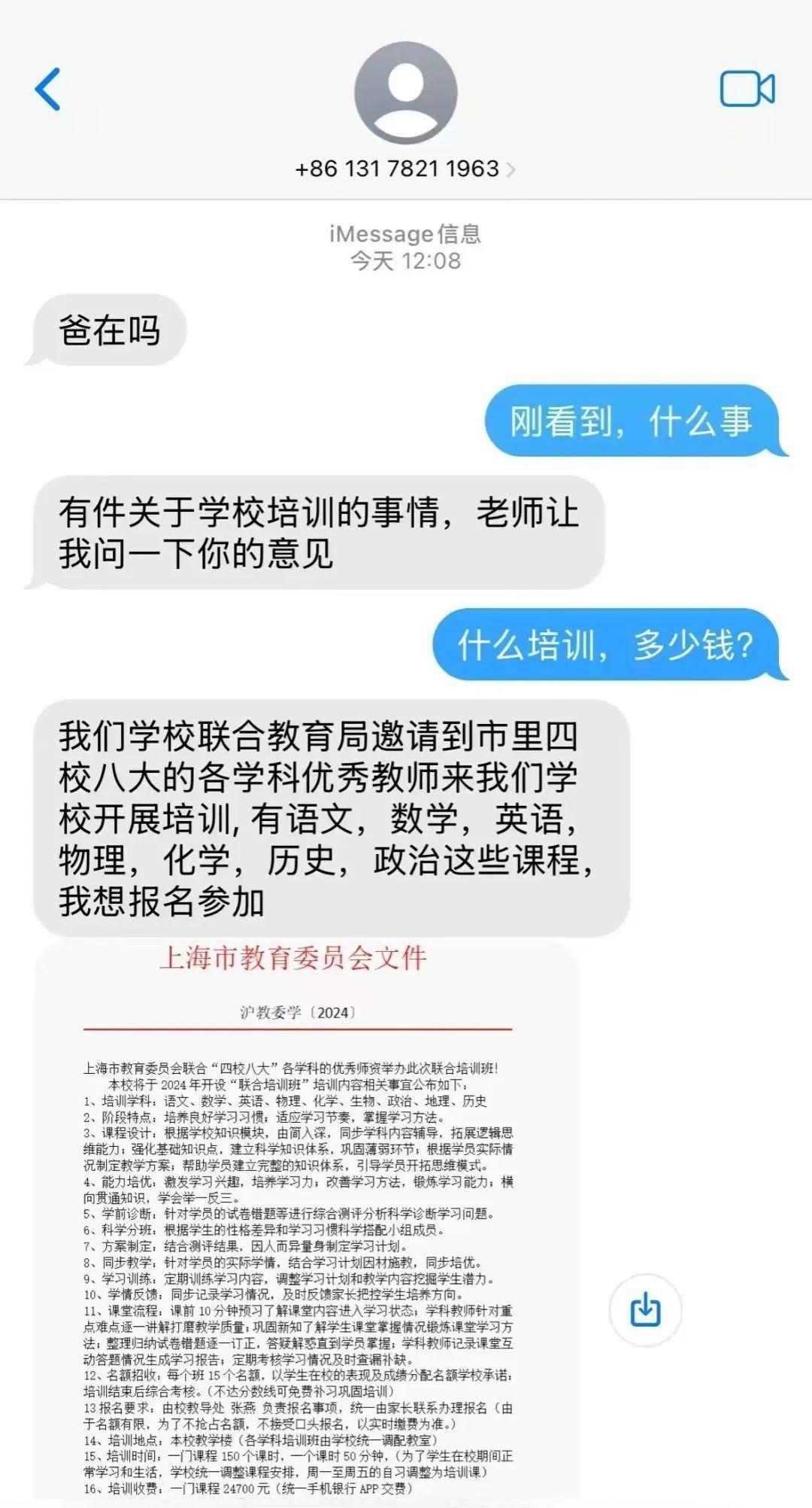 近日,上海多所中学家长收到诈骗短信,内容称孩子想报名参加市教委举办的培训班,培训费一门课1万元,并附伪造的“市教委文件”。短信多通过iMessage发送,号码归属地非本市,以“校讯通”或“电脑教室上课”为由,称学生不能接电话,诱导家长缴费。