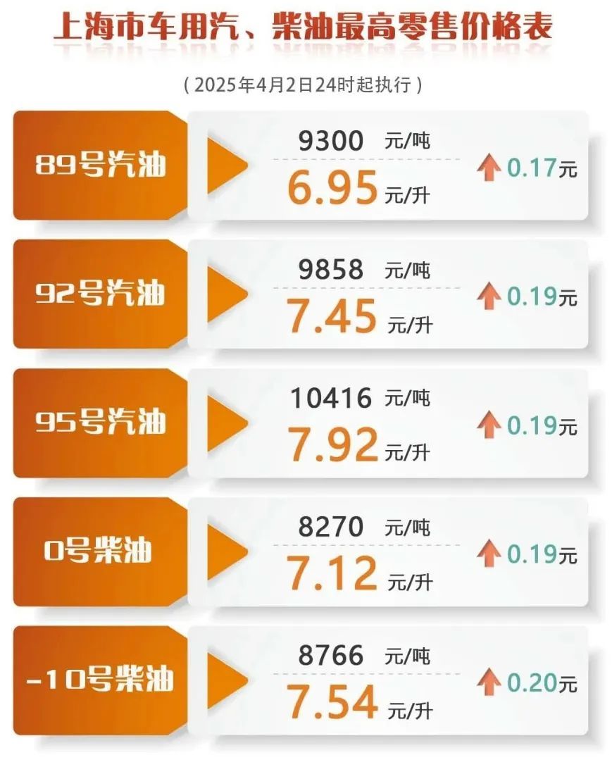自4月2日24时起,新一轮成品油调价,上海92号汽油为7.45元/升,95号汽油7.92元/升,0号柴油7.12元/升。
