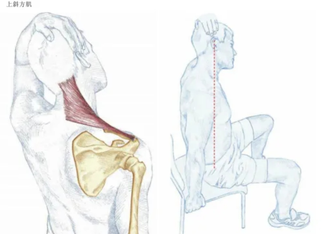 坐在椅子上,双脚分开一定距离,躯干中立,背部和腹部稍微收紧。保持头部竖直,右手抓住椅子边缘,左手扶住头部,轻轻将头部拉动向左侧屈,同时两眼向斜下方看,感受到右侧颈部、右肩、右上臂有明显牵拉感,持续拉伸肌肉 10-15 秒。