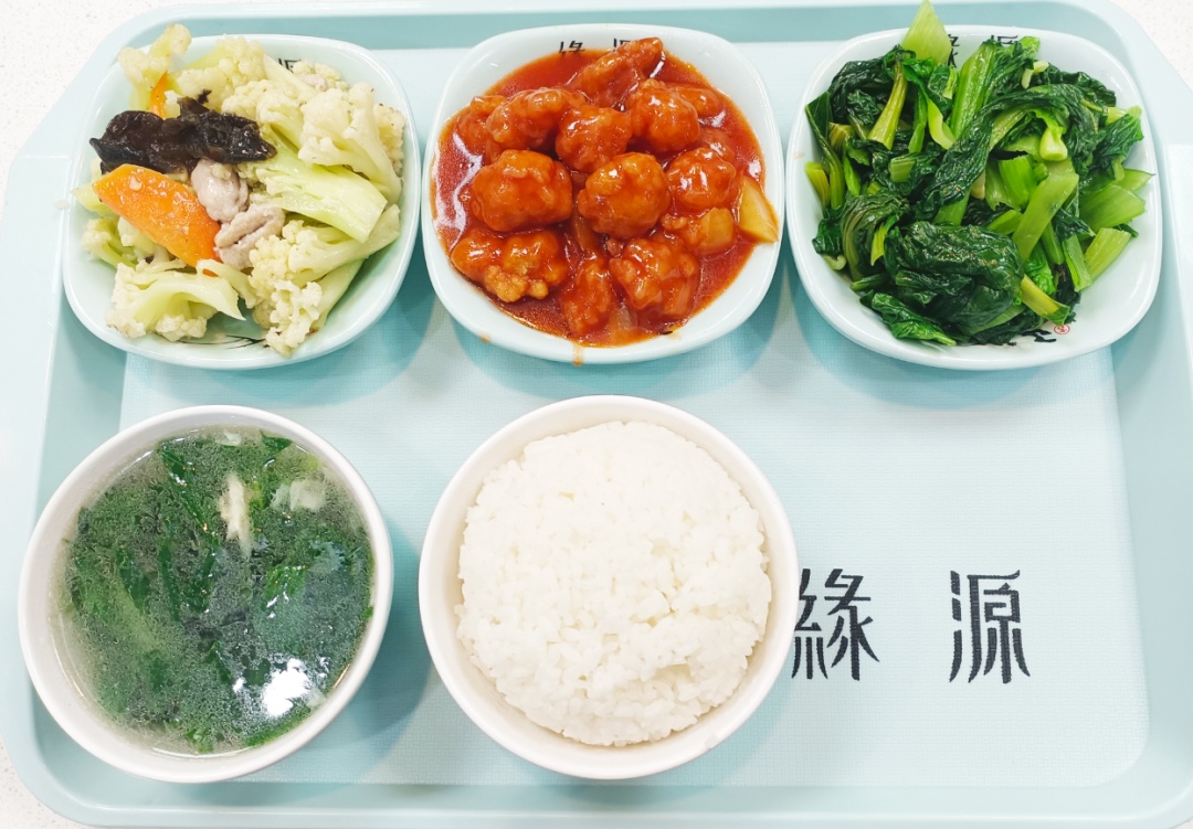 两大荤(四选二,如糖醋排条、油爆虾、粉蒸肉、红烧狮子头)、两素菜(每天提供2种不同时蔬)