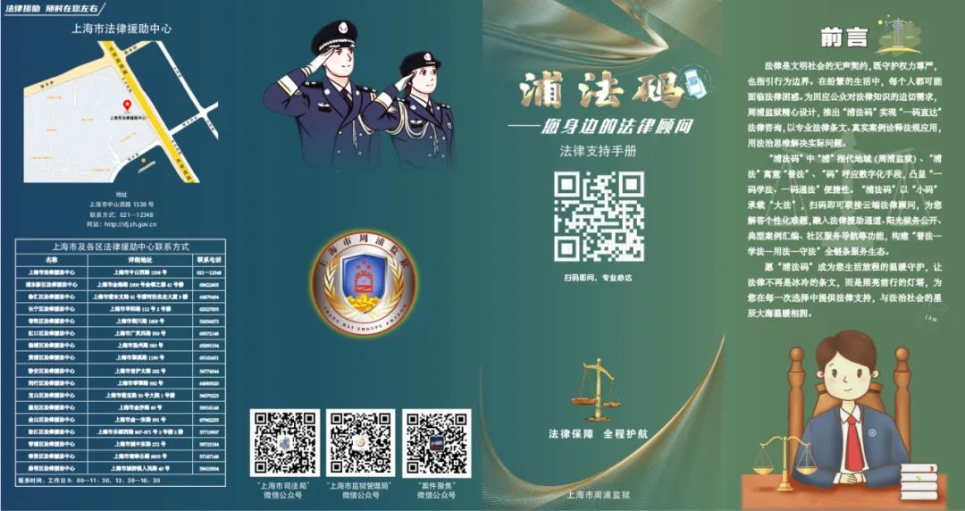 在周浦监狱,无论是罪犯刑释前,还是家属会见时,都能收到一本“‘浦法码’法律支持手册”。翻开手册,除了刑释后“高频问题解答”、全市各法援中心联系方式等内容外,更引人注意的是手册封面和背面的几个二维码。