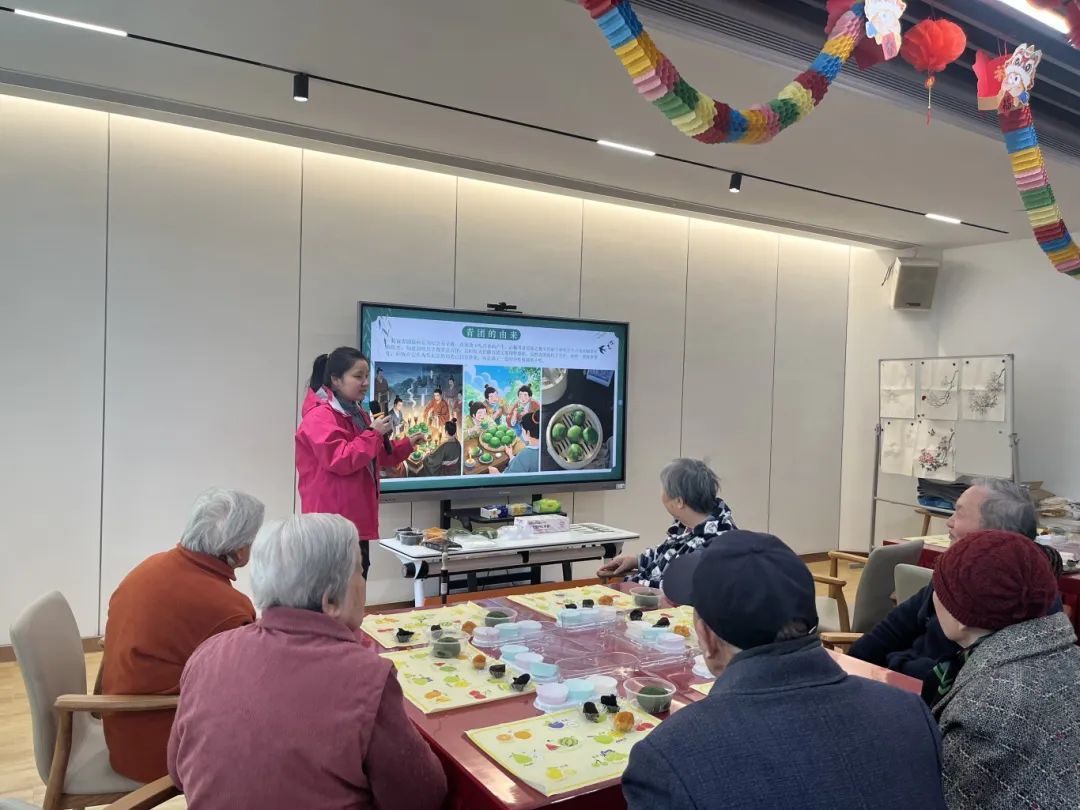 本次活动不仅邀请了敬老院的老人参与,还开放给社区居家养老的老人参加。居家养老的张爷爷来到现场与老伙伴们一起制作青团,闲话家常。“感觉很好,很感谢。”张爷爷简单的话语中透露出满满的喜悦。