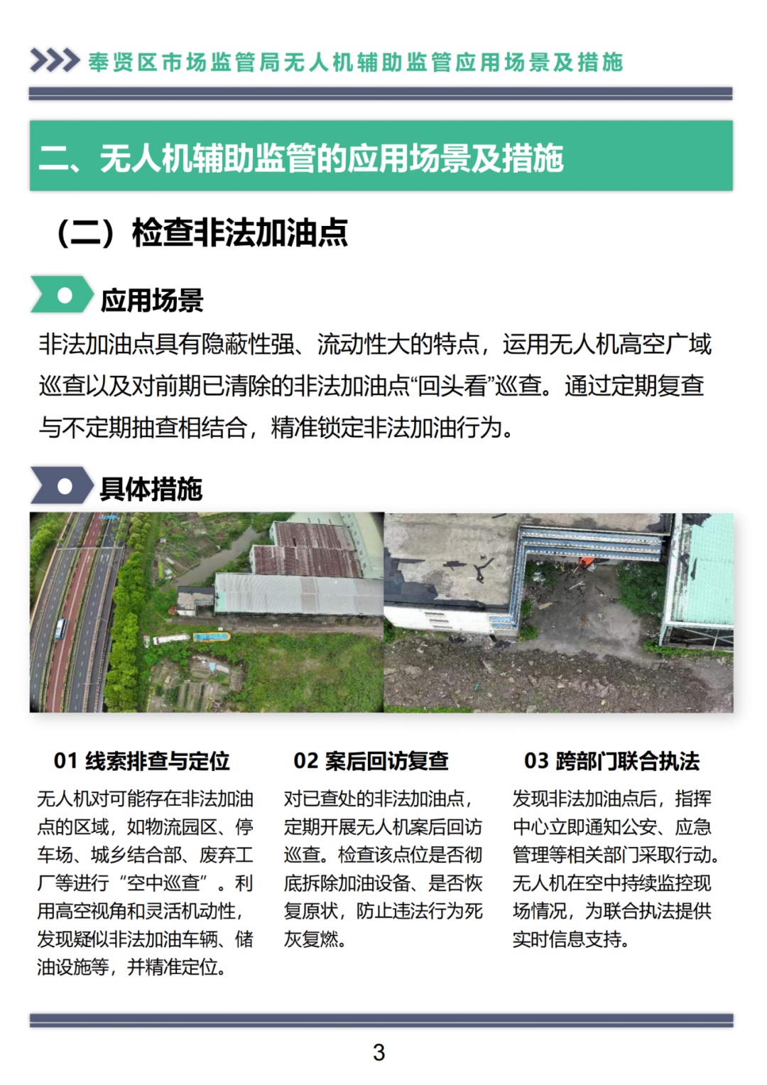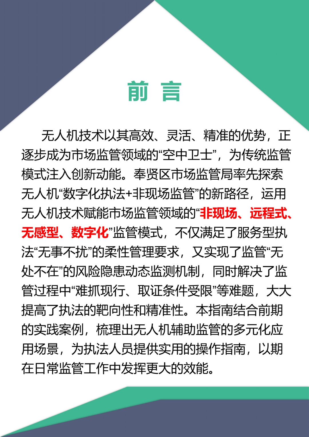 为贯彻落实优化营商环境改革要求,奉贤区市场监管局创新推出《无人机辅助监管应用场景指南》,构建“非现场、远程式、无感型、数字化”监管新模式,有效破解传统监管中“过度检查”与“风险遗漏”并存的难题,以“三大突破”为监管效能提供“科技护航”。