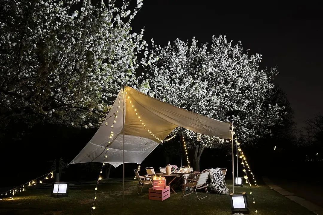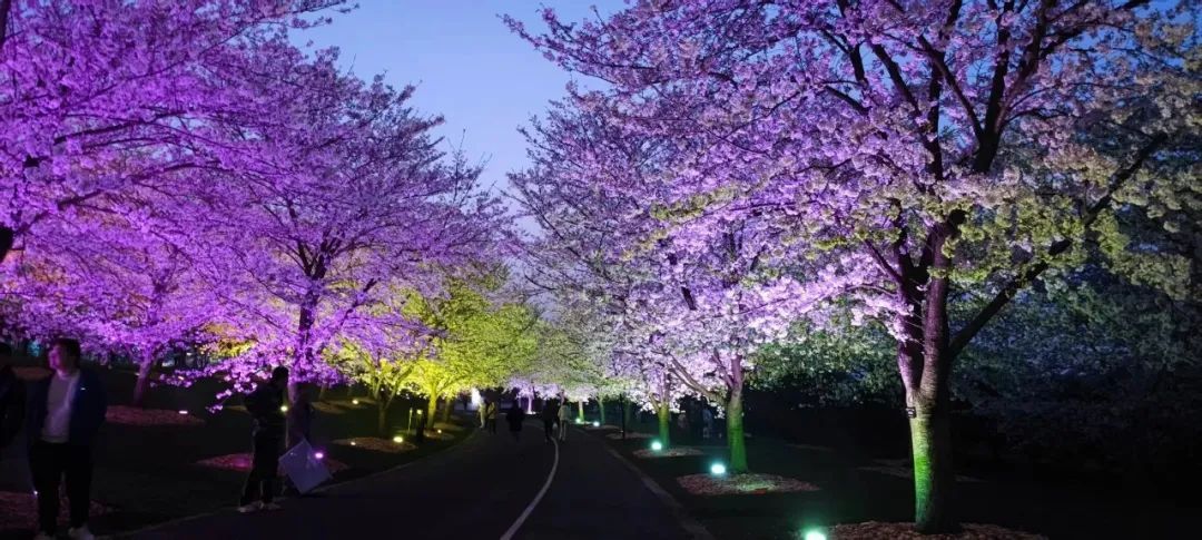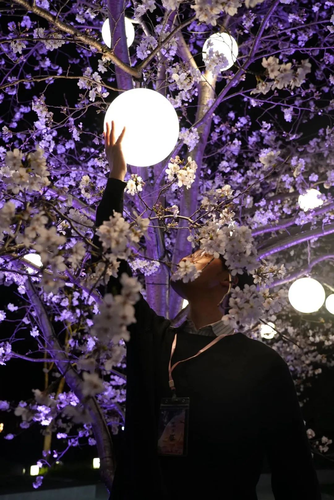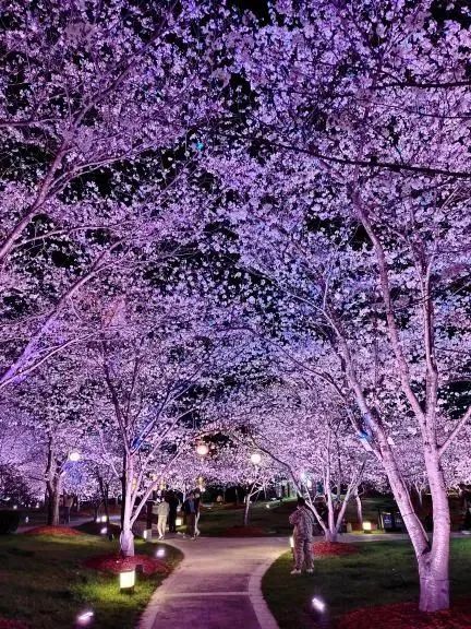 夜幕降临,辰山植物园樱花大道在灯光映衬下如梦似幻,游客穿梭其间,欣赏夜幕中盛开的樱花。