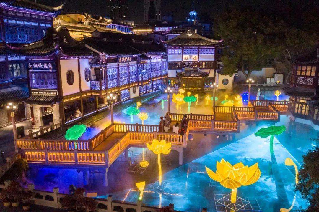 夜幕初垂,九曲桥荷花池泛起金色涟漪,桥畔的激光光束融合雾森,营造九曲烟波中浩渺的仙境即视感,打造的沉浸式国风场景。