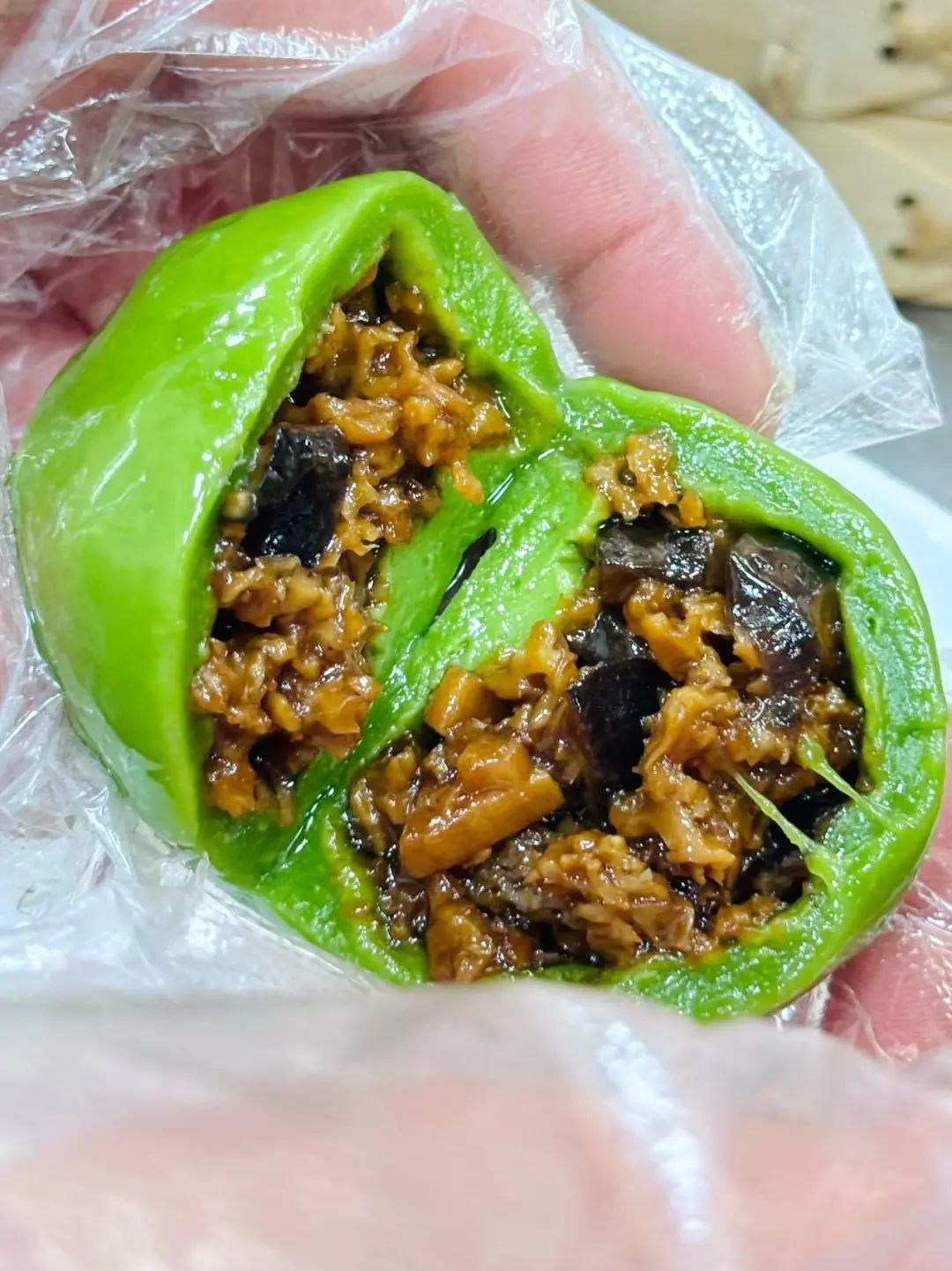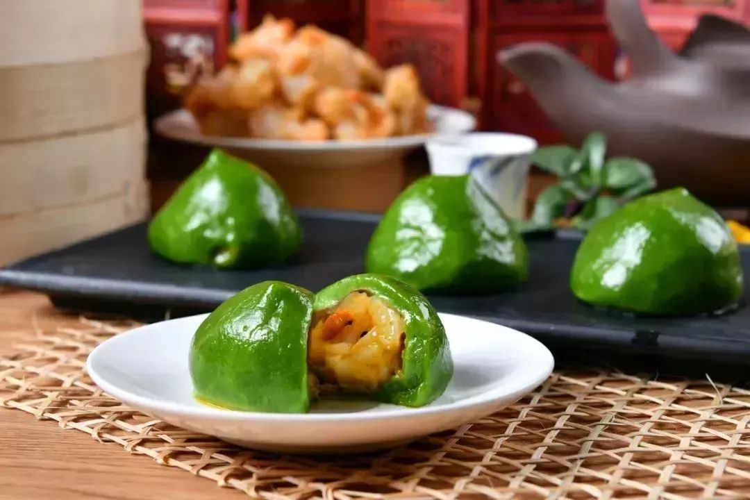 青团里包裹着一整只Q弹的蟹粉明虾,一口咬开,鲜香四溢
