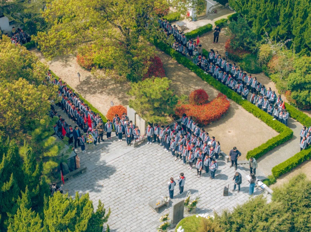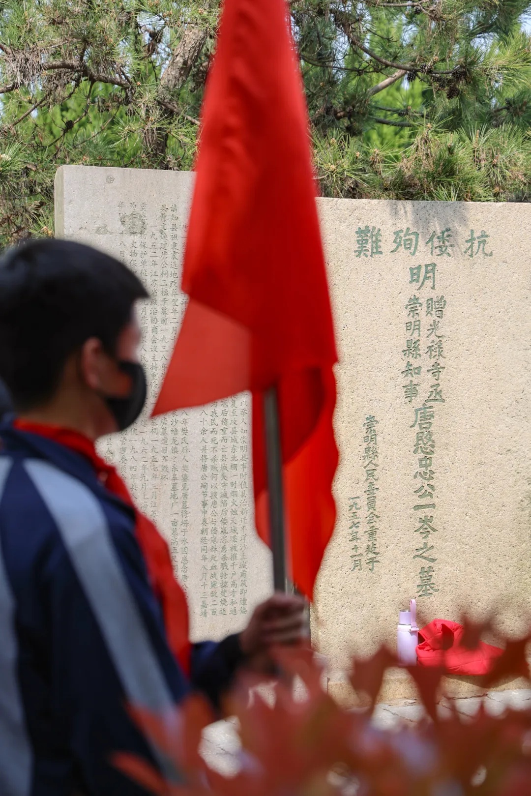 抵达祭扫现场,庄严肃穆的氛围扑面而来。唐一岑烈士纪念碑在苍松翠柏的环绕下,更显巍峨。崇明体育学校的师生们身着整齐的运动装,东门中学的学生们则穿着统一的校服。他们手中,有的是绽放的菊花,花瓣层层舒展,如霜似雪;有的是亲手制作的白花,虽是简易纸张折叠而成,却在边角的褶皱里藏着用心。在工作人员的引导下,所有人在纪念碑前整齐列队,现场一片寂静。