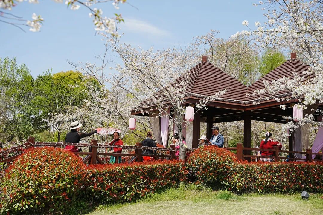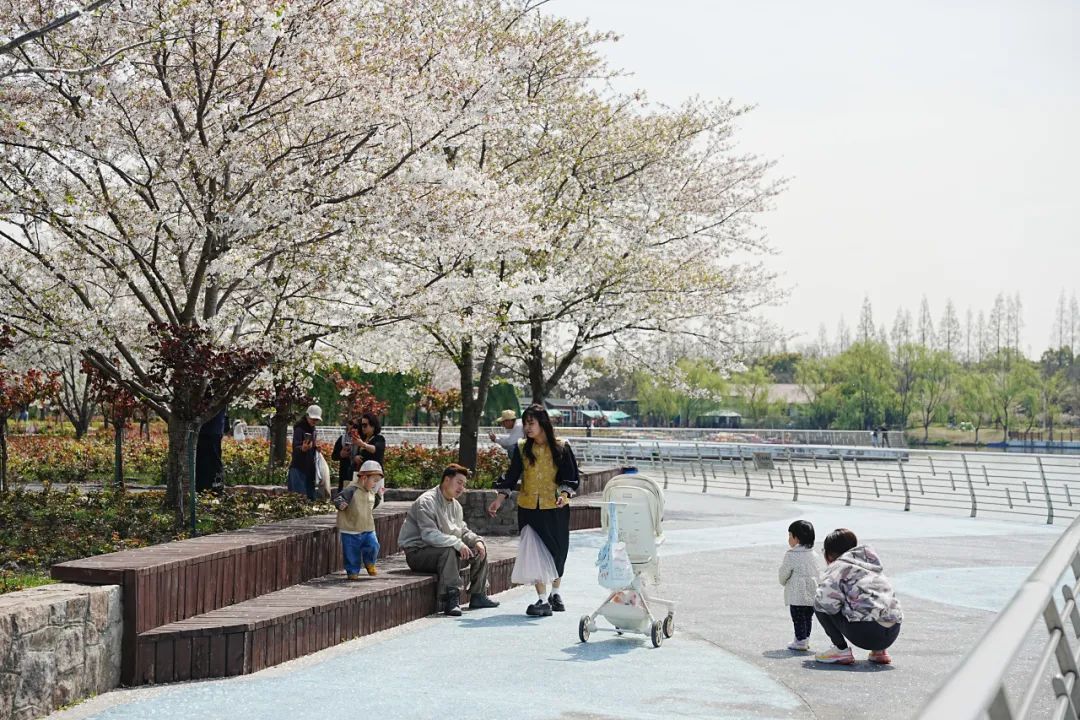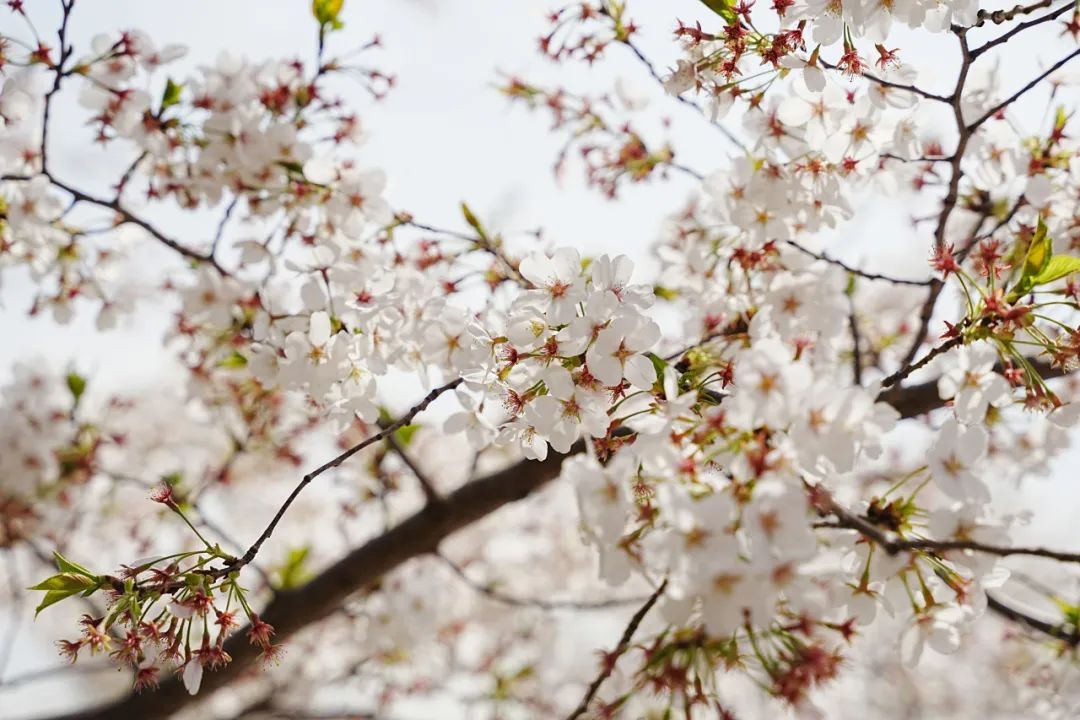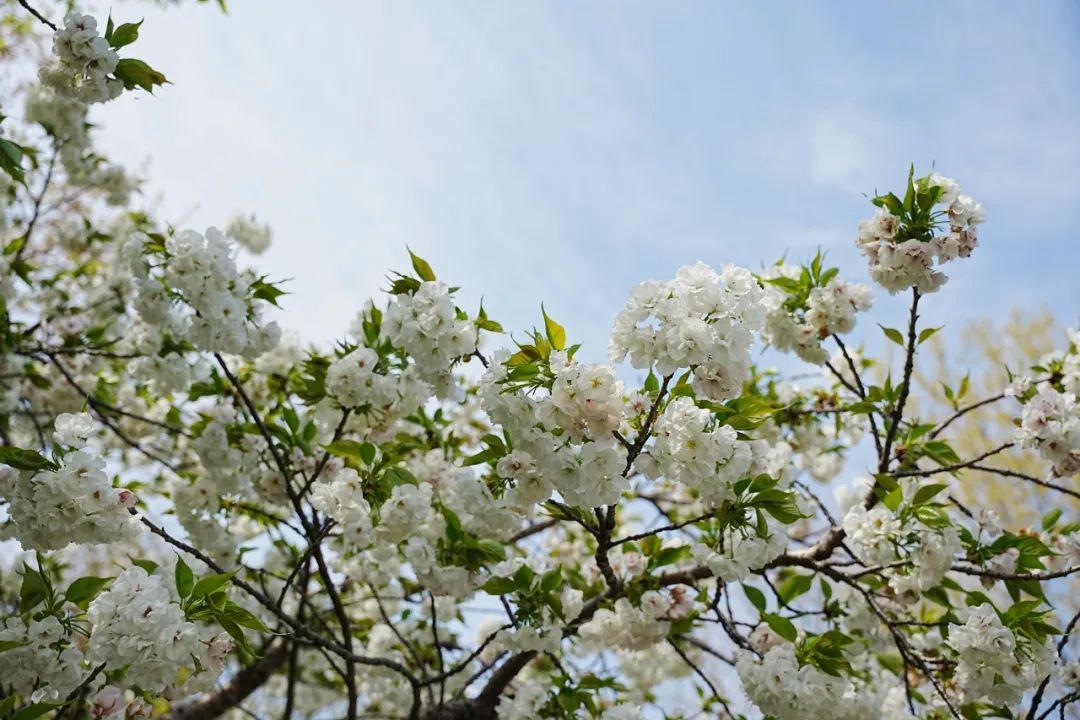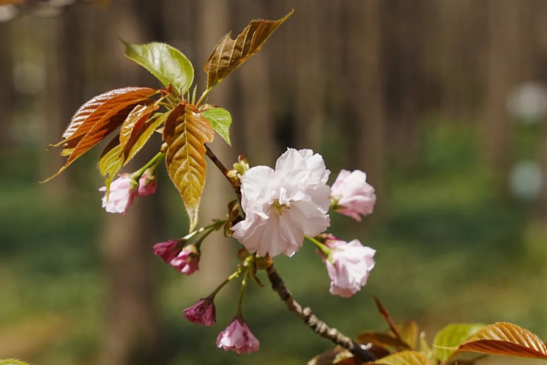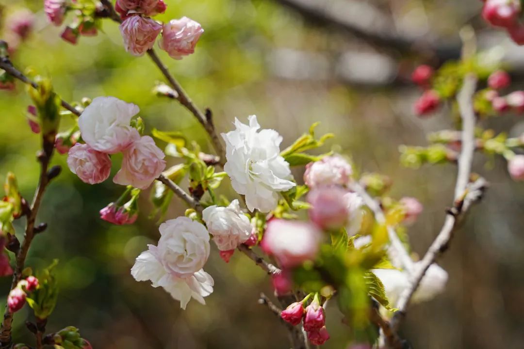 晚樱大面积萌动,目前处于初花阶段,关山、兰兰、郁金等预计在清明假期进入观赏期。
