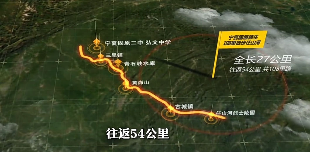 1995年清明节前,固原二中初一年级(后初中部剥离成立弘文中学)6个班372名学生踏上征程。除少数生病体力不支的学生在返程最后5公里坐车外,绝大部分同学走完全程。自此,作为一项清明节前的特殊实践课,“百里壮行任山河”在这两所学校传承了下来。这堂“行走的思政课”,至今已坚持了30年,共有3万多名学生在致敬英雄中传承红色基因。