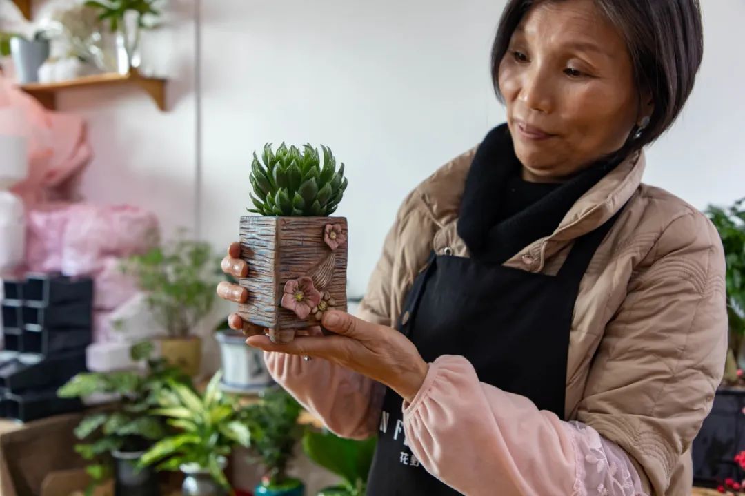 老板娘精心挑选了一盆玉露推荐给久坐办公室的人群:“盯着电脑屏幕时间长了容易眼睛疲劳,这款玉露体积小不占地方,眼睛累了可以看看绿色放松一下。而且养护也非常简单,玉露喜湿,多浇点水也没事,对光照需求也不是很强,非常适合白领。”