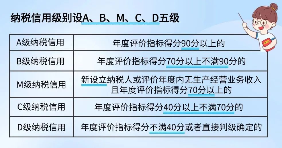 根据《国家税务总局关于发布<纳税信用管理办法(试行)>的公告》(国家税务总局公告2014年第40号)第十八条和《国家税务总局关于纳税信用评价有关事项的公告》(国家税务总局公告2018年第8号)第三条规定,纳税信用级别设A、B、M、C、D五级,A级纳税信用为年度评价指标得分90分以上的;B级纳税信用为年度评价指标得分70分以上不满90分的;M级纳税信用为新设立纳税人或评价年度内无生产经营业务收入且年度评价指标得分70分以上的;C级纳税信用为年度评价指标得分40分以上不满70分的; D级纳税信用为年度评价指标得分不满40分或者直接判级确定的。