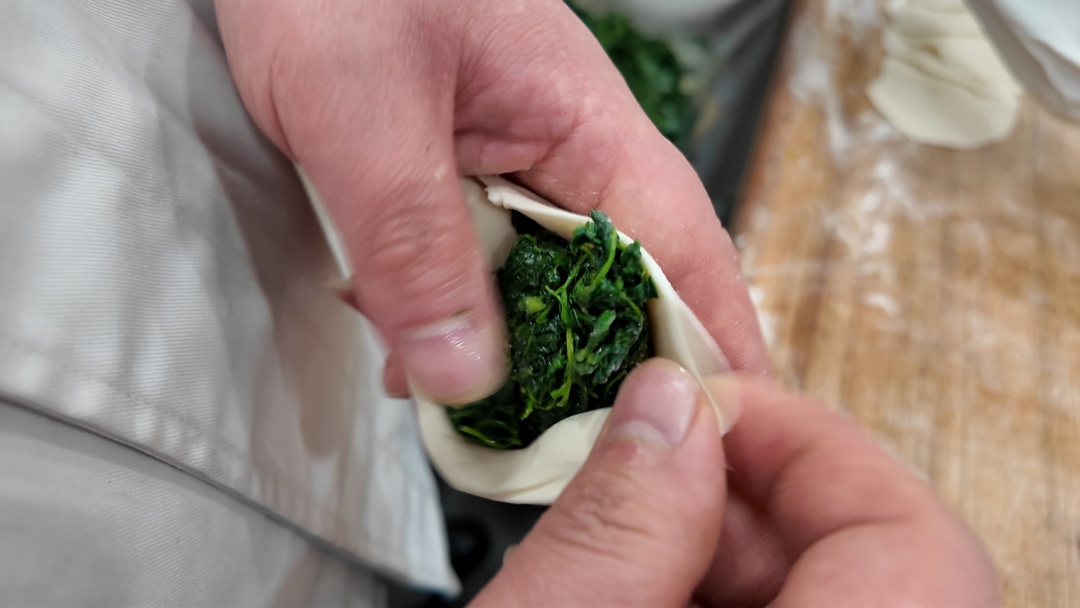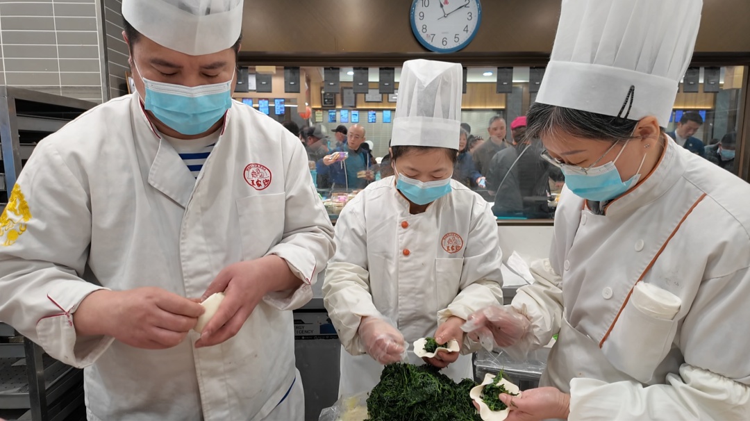 为保证草头大包的品质,制作过程颇为讲究。师傅们会仔细地人工掐掉口感欠佳的杆茎部分,只留下最嫩的草头。草头焯水后,会立即放入冰水中,加入调料,从而保持草头的翠绿色泽和鲜嫩口感。此外,由于草头馅料的不规则,制作时需将面胚反复按压至理想的韧劲和均匀度,再以28个褶子细致收口,每个包子都是现包现蒸,保证新鲜出炉。