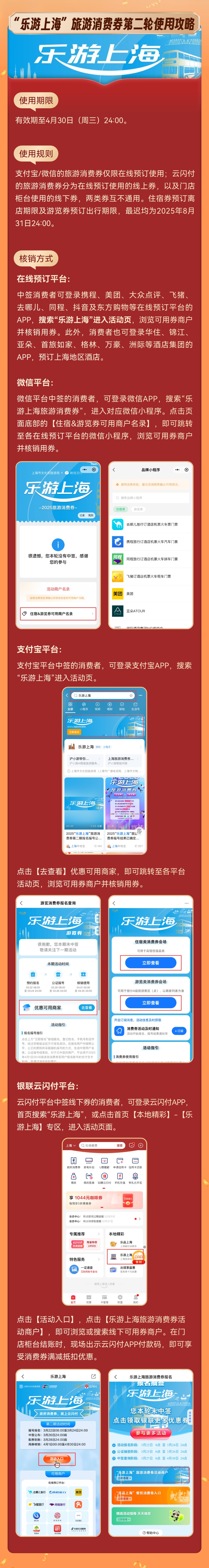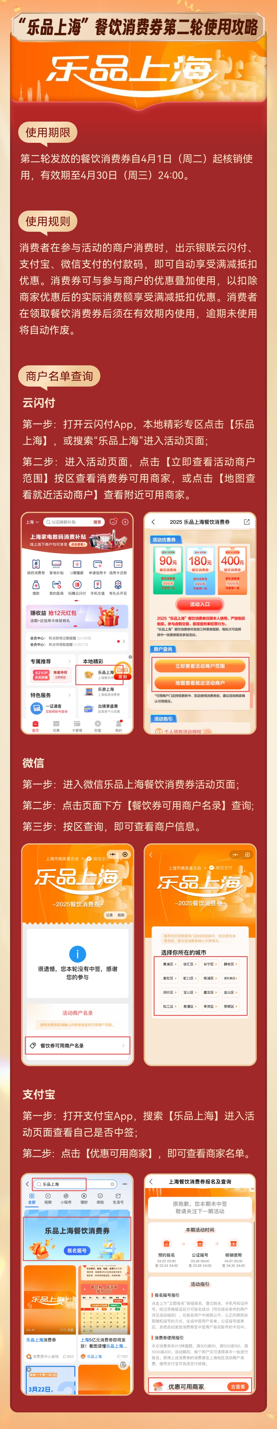 四月申城春意浓,正是出游好时节。第二轮乐·上海消费券即日起可进行核销使用,助力市民游客解锁沪上潮流玩法。消费券使用期限截至何时?使用规则有哪些?如何查询优惠可用商户名单?快来Get市商务委、市文化旅游局带来的这份详细攻略~