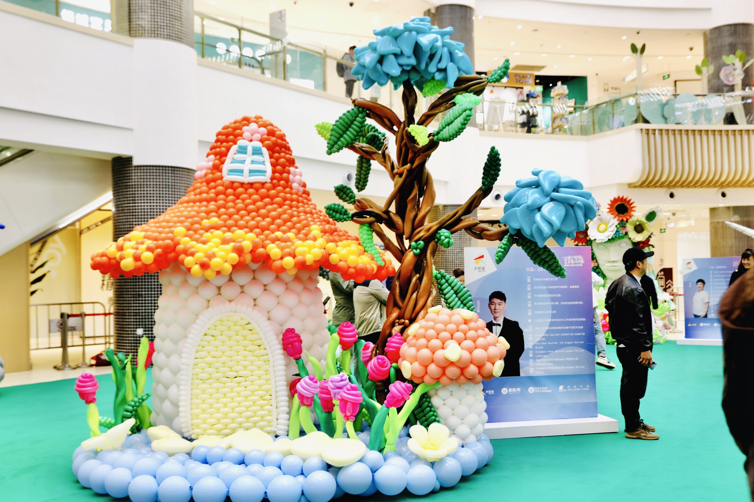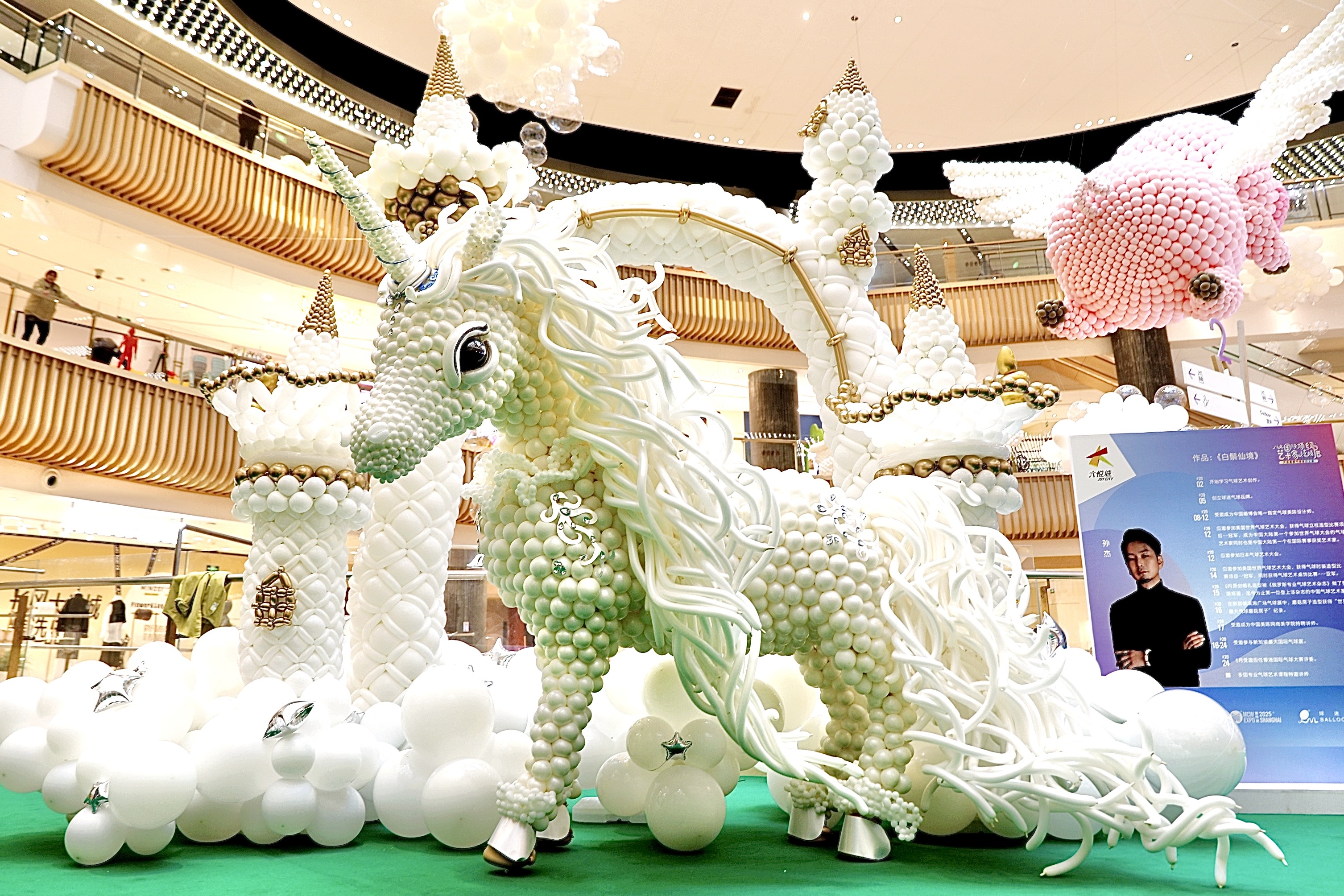 记者在长风大悦城看到,各式各样的气球雕塑摆件琳琅满目,令人目不暇接。这些气球艺术品不仅造型独特、色彩斑斓,还充满了艺术感和趣味性。 有的气球被塑造成憨态可掬的动物形象,如独角兽、大象、蝴蝶等,仿佛从童话世界中走出来;有的则被设计成梦幻般的蘑菇屋、天使猪等场景,让人仿佛置身于一个充满想象力的世界。
