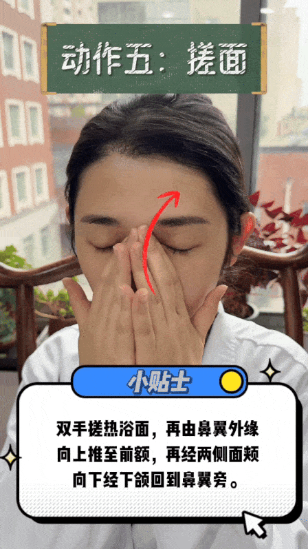 双手搓到发热后捂脸,再从鼻翼向上推到额头,再由前额经两侧面颊向下经下颌回到鼻翼旁。