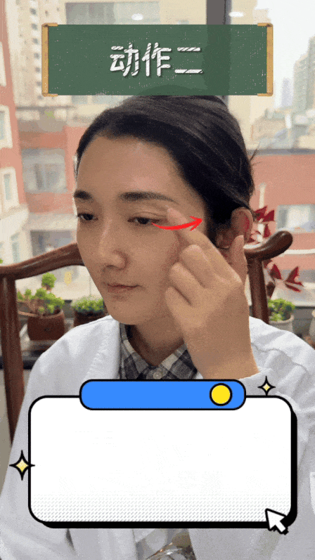 用食指,从内眼角向太阳穴轻推,仿佛在给眼角画上一道彩虹。
