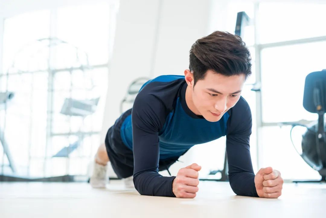 脸朝下俯卧,脚趾抓地,双臂伸直,支撑起躯干,核心部位收紧,保持躯干呈平板状。相对应的降阶锻炼法:跪姿平板,膝盖着地,保持手臂伸直,身体核心收紧。2. 靠墙静蹲
