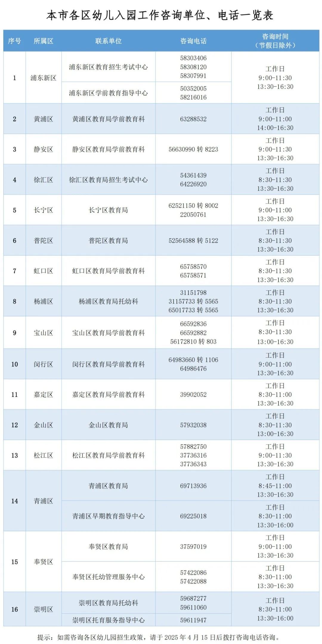 可通过“上海发布”“上海教育”以及各区、各街镇、各幼儿园、各区早教指导服务机构等官方微信公众号、网站等方式查询今年的入园工作相关具体信息,了解办理方式、办理时间、招生范围和报名条件等。