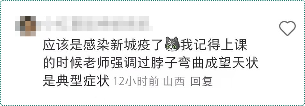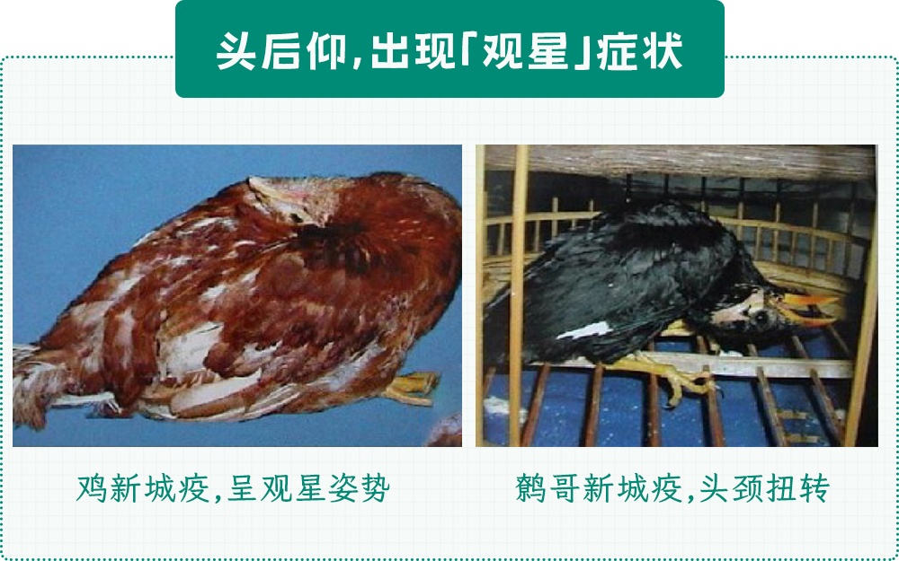 这种颈部扭转、头部后仰,呈望天状的姿势,医学上被称为「观星」,是新城疫的典型症状。