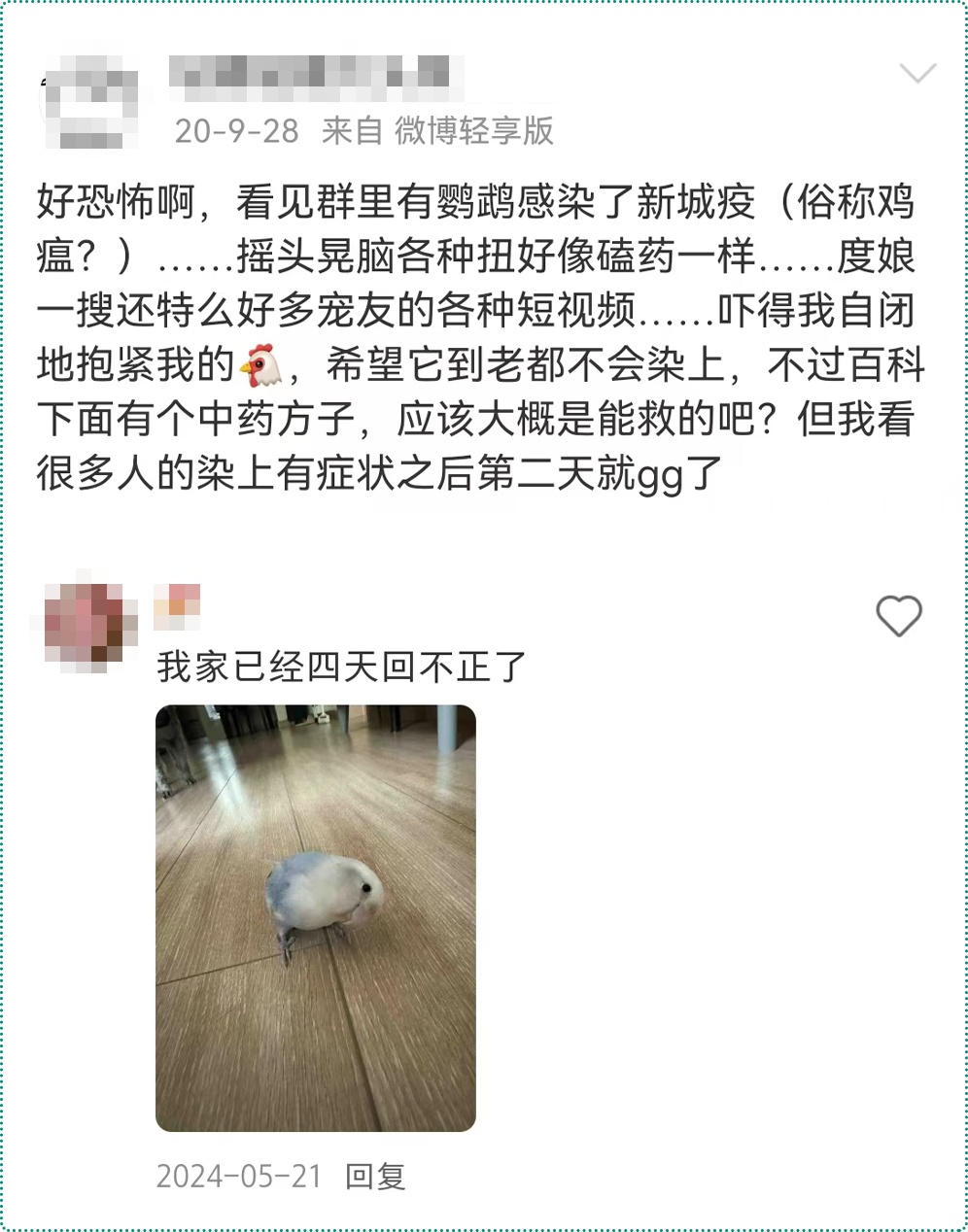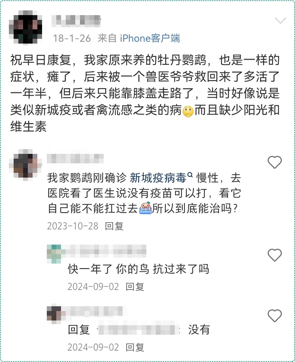 新城疫对鸟类极为危险,一旦染上了,死亡率非常高,重则会让鸟类毫无征兆地直接倒地死亡。