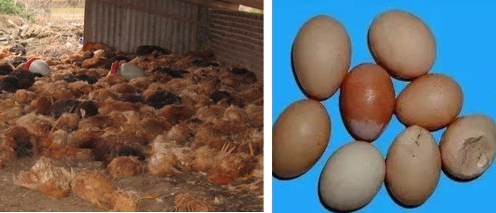 养鸡、鸭、鹅厂一旦出现新城疫,不仅会造成大规模死亡,而且产蛋量也会骤降,出现大量软壳蛋、畸形蛋。