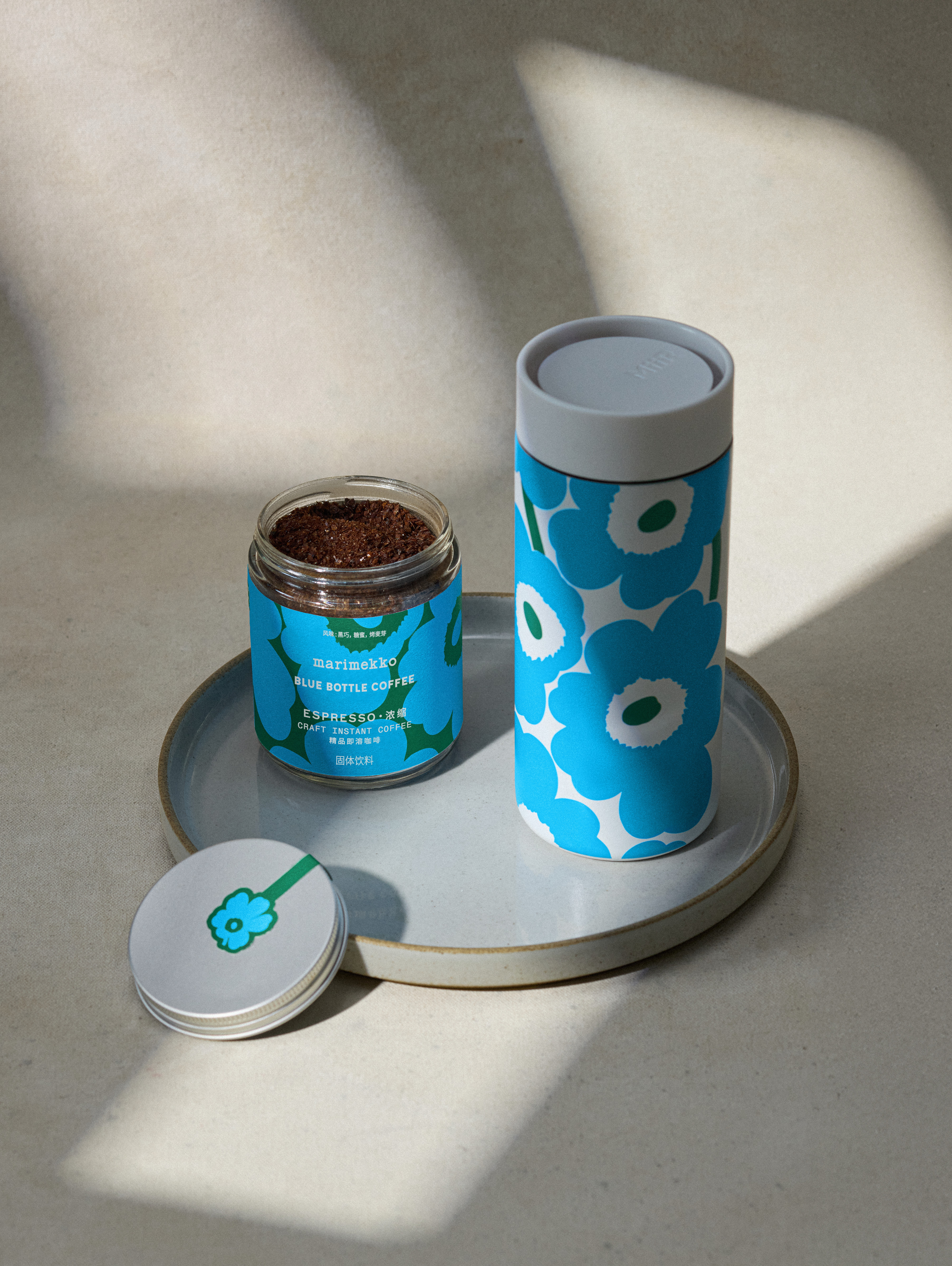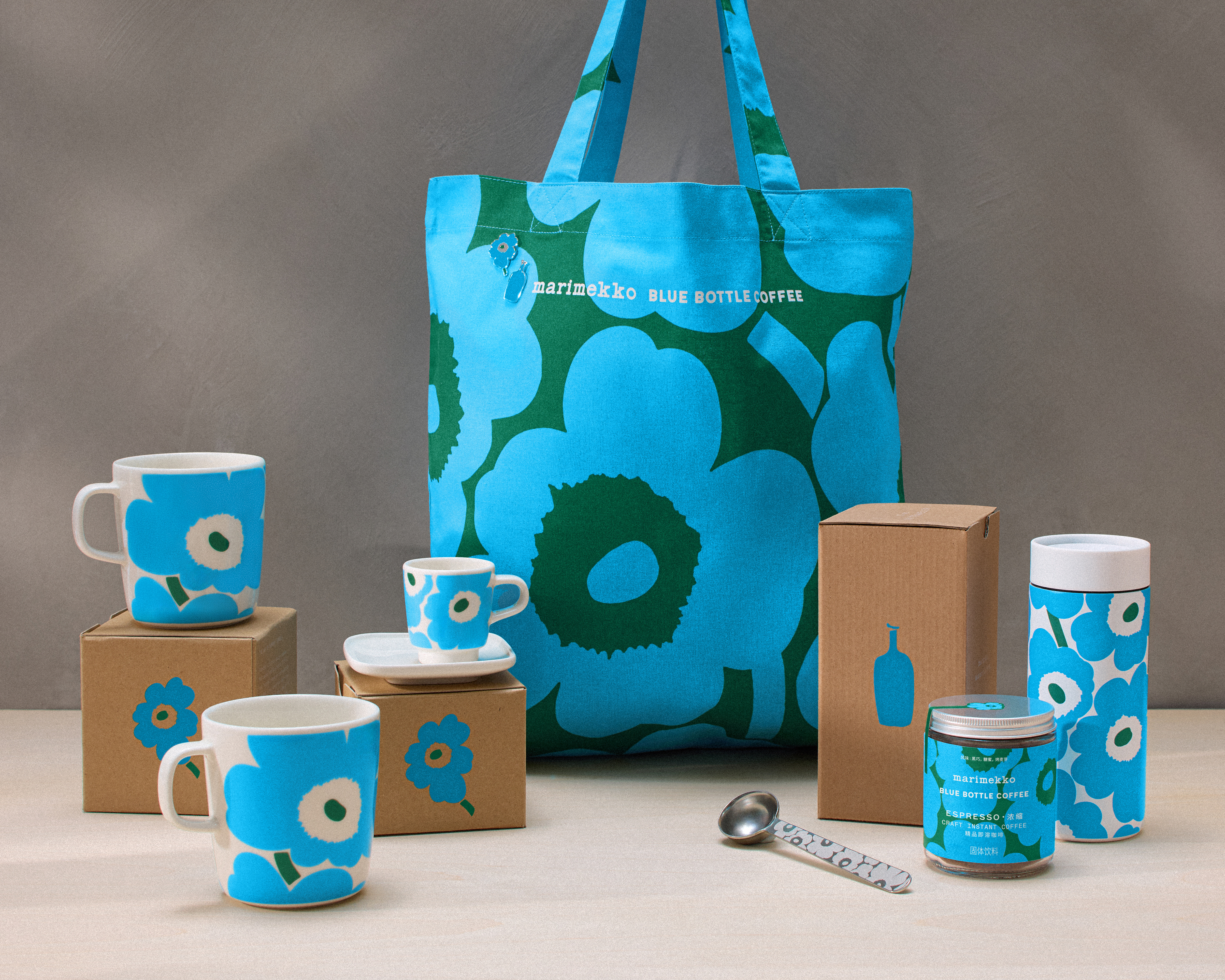 此次蓝瓶咖啡与Marimekko跨界合作推出的联名限定系列,不仅有轻盈柔和风味的新品咖啡,还有采用Marimekko经典的“Unikko”游霓可印花设计,并以本次合作的特别配色——北欧绿与蓝瓶蓝限定呈现的马克杯、MiiR360随行杯、浓缩杯碟套组、咖啡勺、手提袋、珐琅胸针、围裙(仅于亚洲市场贩售)等限定商品。“Unikko”游霓可印花限量版蓝瓶精品即溶咖啡(浓缩)-罐装也将同步上市,方便咖啡爱好者们在家轻松复刻芬兰风味。