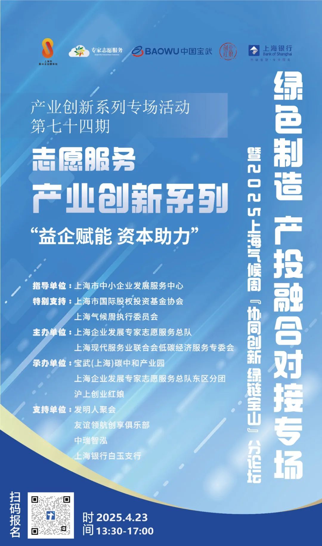 产业创新系列第74期“绿色制造”产融对接专场活动特别联动总队东区分团,以及上海气候周执行委员会、上海现代服务业联合会低碳专委会、宝武(上海)碳中和产业园等单位共同举办。