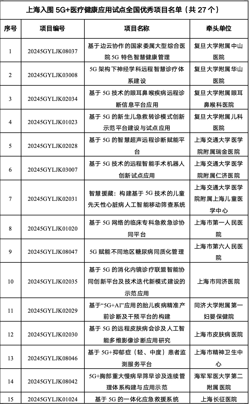 近日,工业和信息化部办公厅与国家卫生健康委员会办公厅联合发布《关于公布5G+医疗健康应用试点全国优秀项目及通过验收项目的通知》,确定了534个全国5G+医疗健康应用试点通过验收项目,并评选出优秀项目274个。上海市以27个项目入选的佳绩,占据全国优秀项目总量的近十分之一,稳居全国第一梯队。