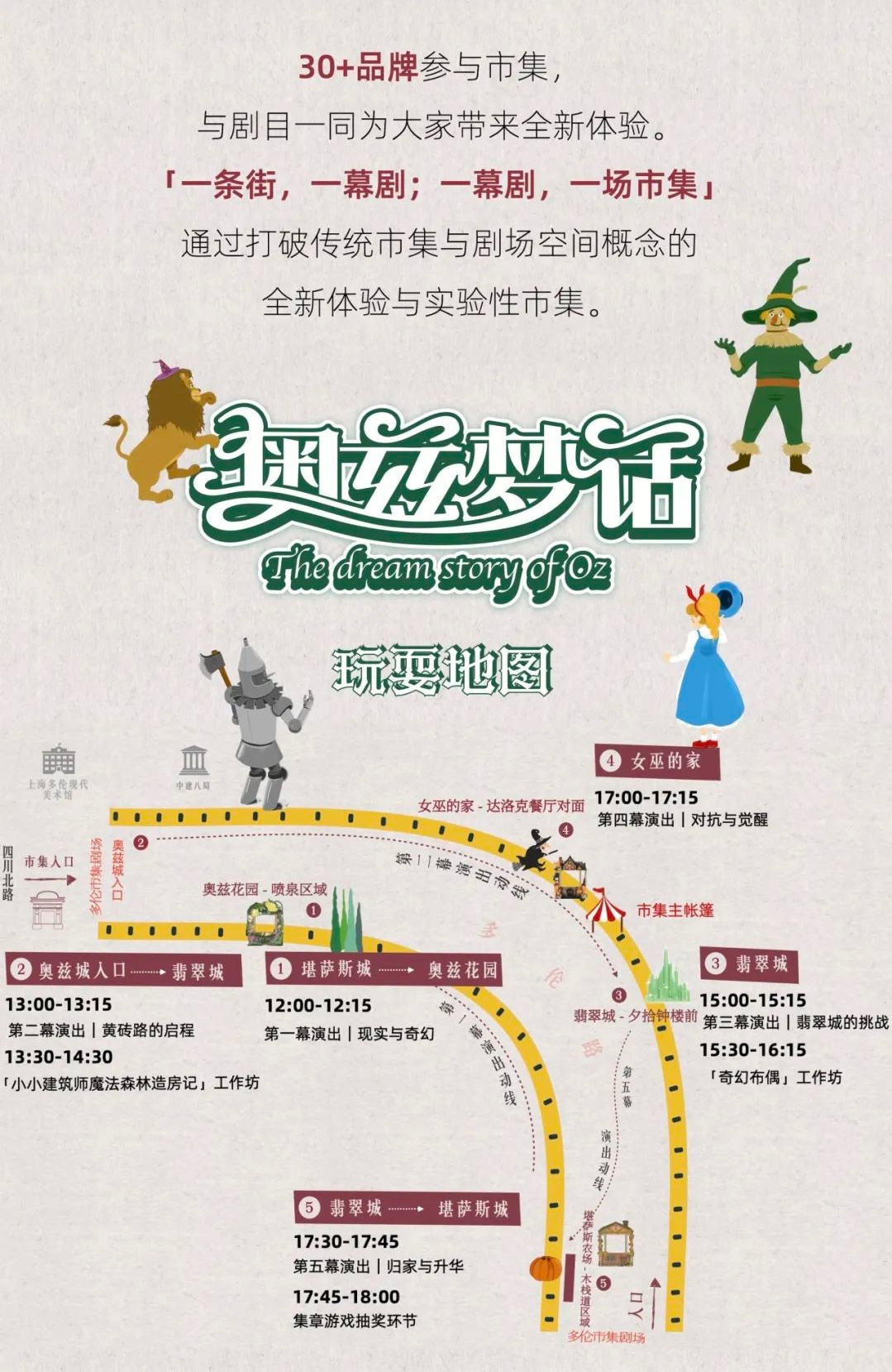 活动以童话经典《绿野仙踪》为灵感,以“剧场+市集”双线交织的形式,构建“边走边演、边逛边入梦”的独特叙事场域,在城市空间中展开一段属于春日的奇幻冒险。