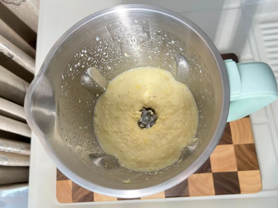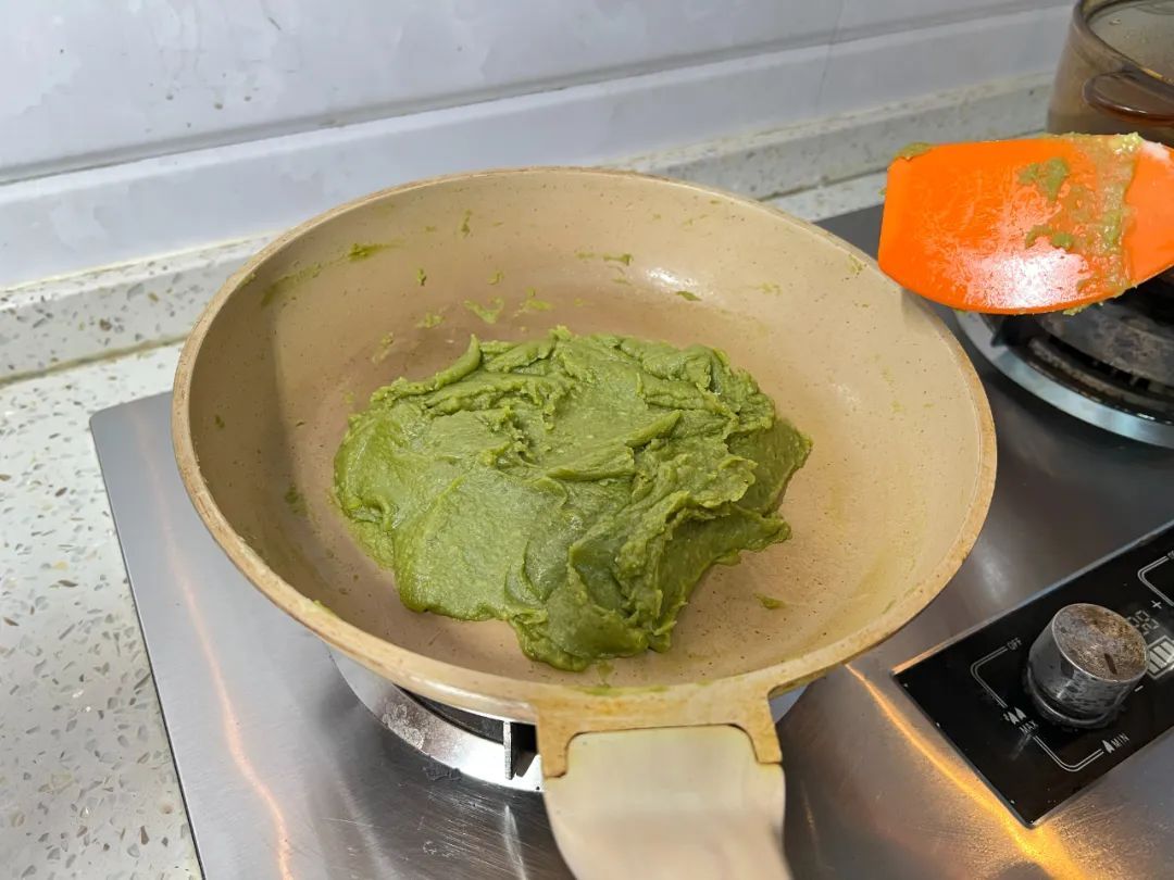 2.将蒸熟的绿豆和140克牛奶倒入搅拌机,打成糊状。