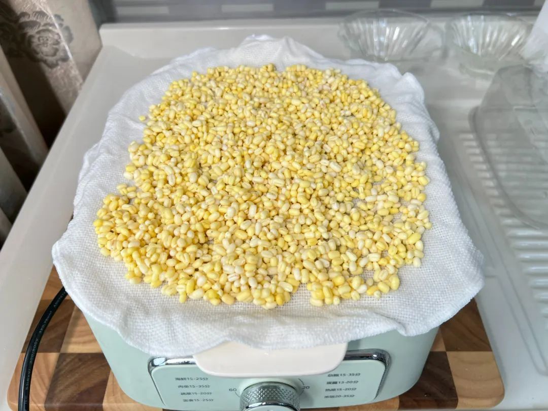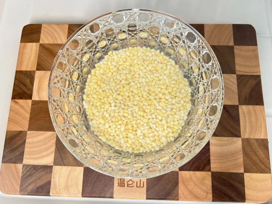 制作步骤 1.100克脱皮绿豆提前浸泡4小时,中途换水2-3次,蒸30分钟。