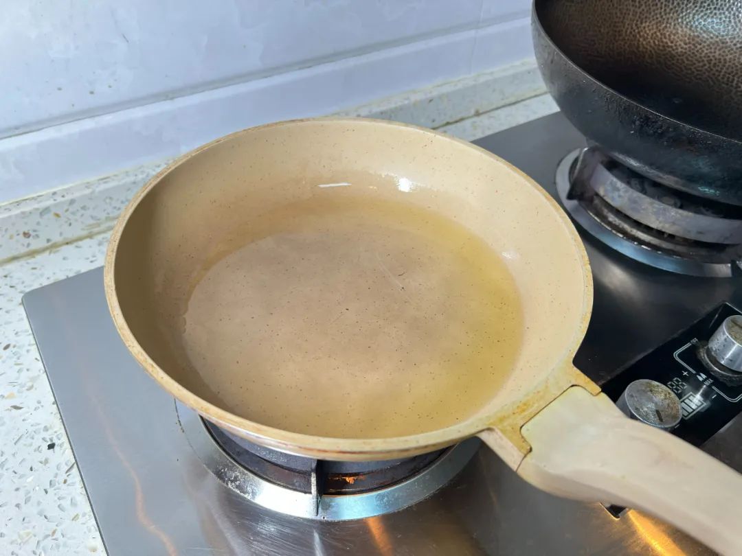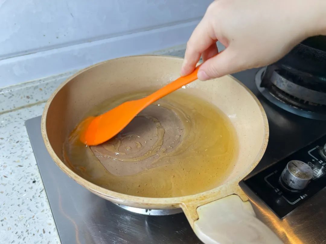 5.调中小火,用不粘锅把32克玉米油加热至100度左右,关火晾凉备用,加入48克蜂蜜搅拌均匀。