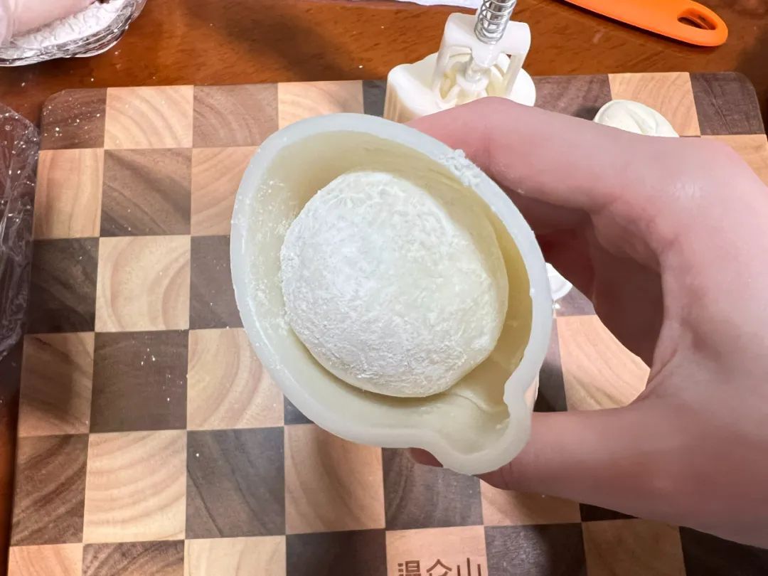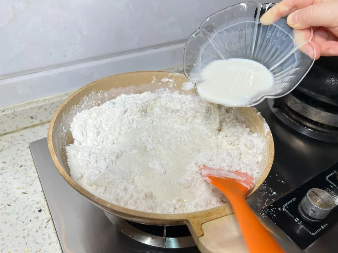 6.倒入蒸熟的粘米粉和糯米粉,大致翻拌均匀后倒入192克牛奶揉搓成团,揉好的面团软硬适中,盆中不沾粉即可。