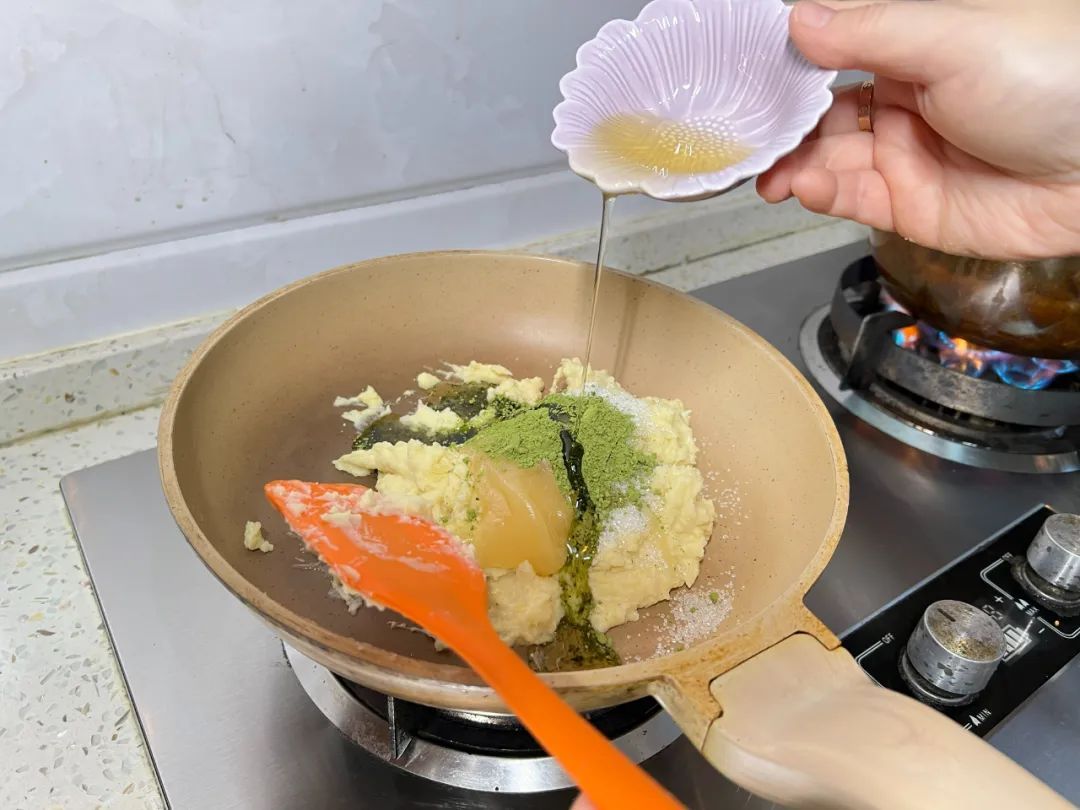 3.倒入不粘锅中,加入40克细砂糖、40克蜂蜜、4克茶粉、1克盐、30克玉米油小火炒至抱团的状态。