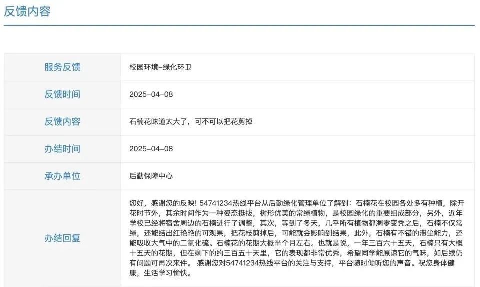 在交大校园生活服务反馈平台上,有同学反映,“石楠的味道太大了,可不可以把花剪掉?”