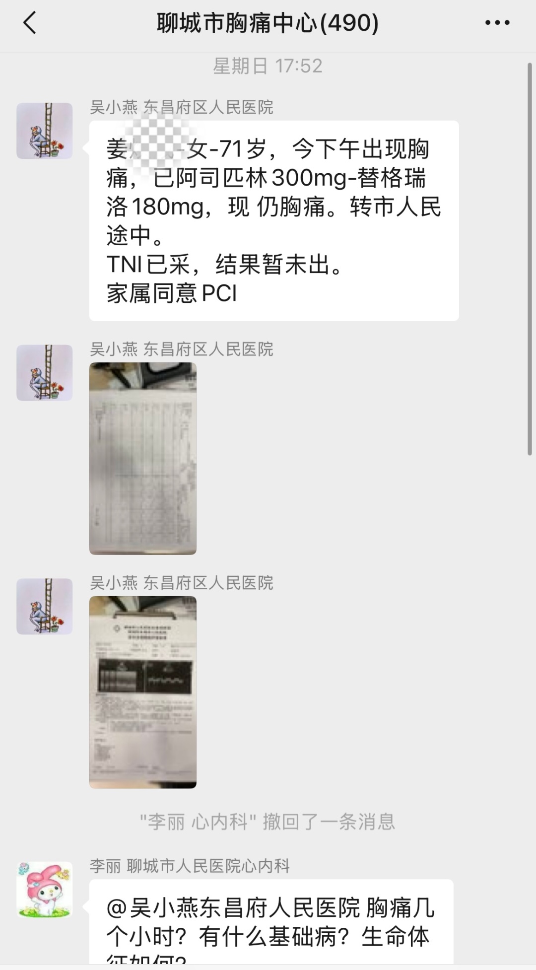 东昌府院区胸痛中心值班人员将姜奶奶的情况上传至聊城市胸痛中心救治群,聊城市人民医院心内科急诊绿色通道值班医生李丽实时对接,电话向家属说明姜奶奶的情况及手术的必要性,取得同意后立即启动胸痛中心急症PCI(经皮冠状动脉介入治疗)患者“双绕行”方案。