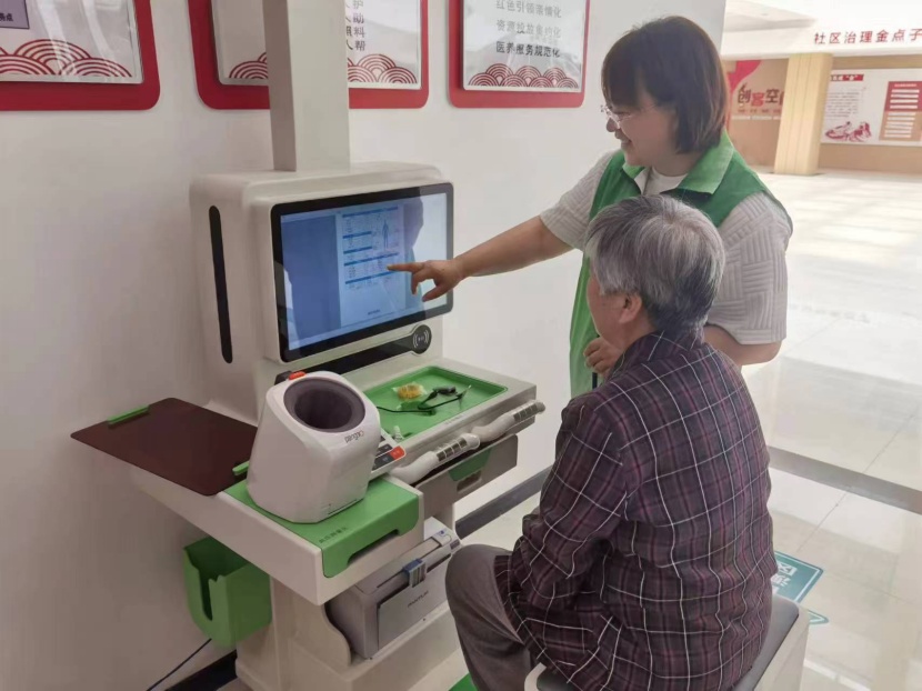 走进龙山社区的健康小屋,一台崭新的健康自测一体机映入眼帘。当老人们前来咨询健康时,医务人员总是热情相迎,引导老人有序使用一体机,细致检测血压、血糖、血脂等各项关键健康指标。检测完毕,医务人员又耐心地为老人解读健康数据,将复杂的医学指标转化为老人能理解的健康建议。通过基本公卫服务系统,医务人员会把查体结果实时上传至居民健康档案系统,方便对老人健康状况进行长期跟踪。