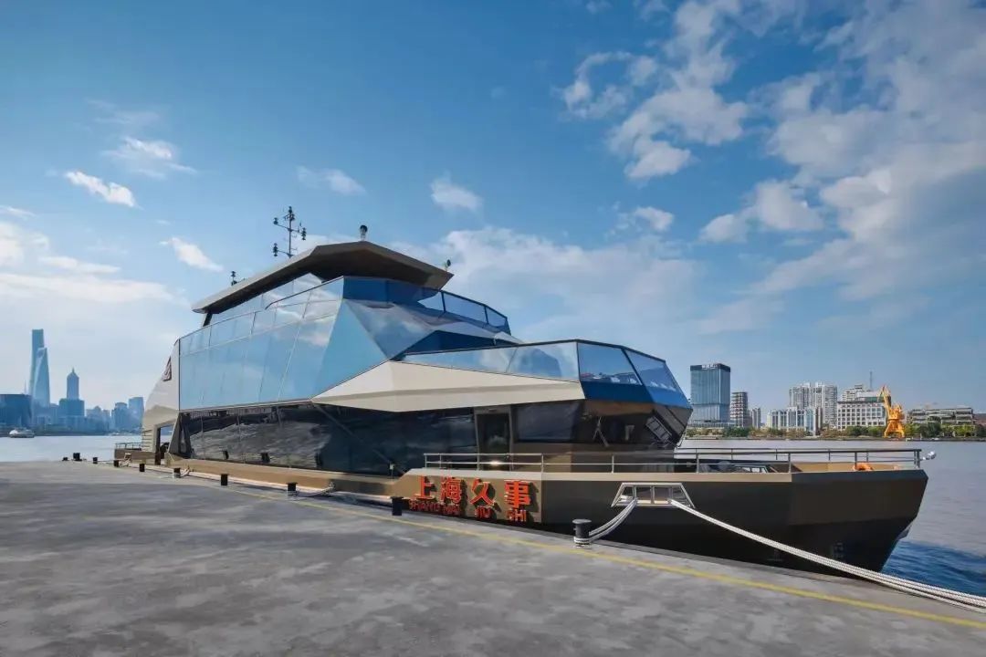 今年3月,新建的黄浦江上第一艘纯电池游览船——“上海久事号”投入运营。这艘纯电动游览船总长41米,宽11.7米,船体共三层,核定载客150人。外形采用钻石切面造型,独特新颖,流畅简洁。