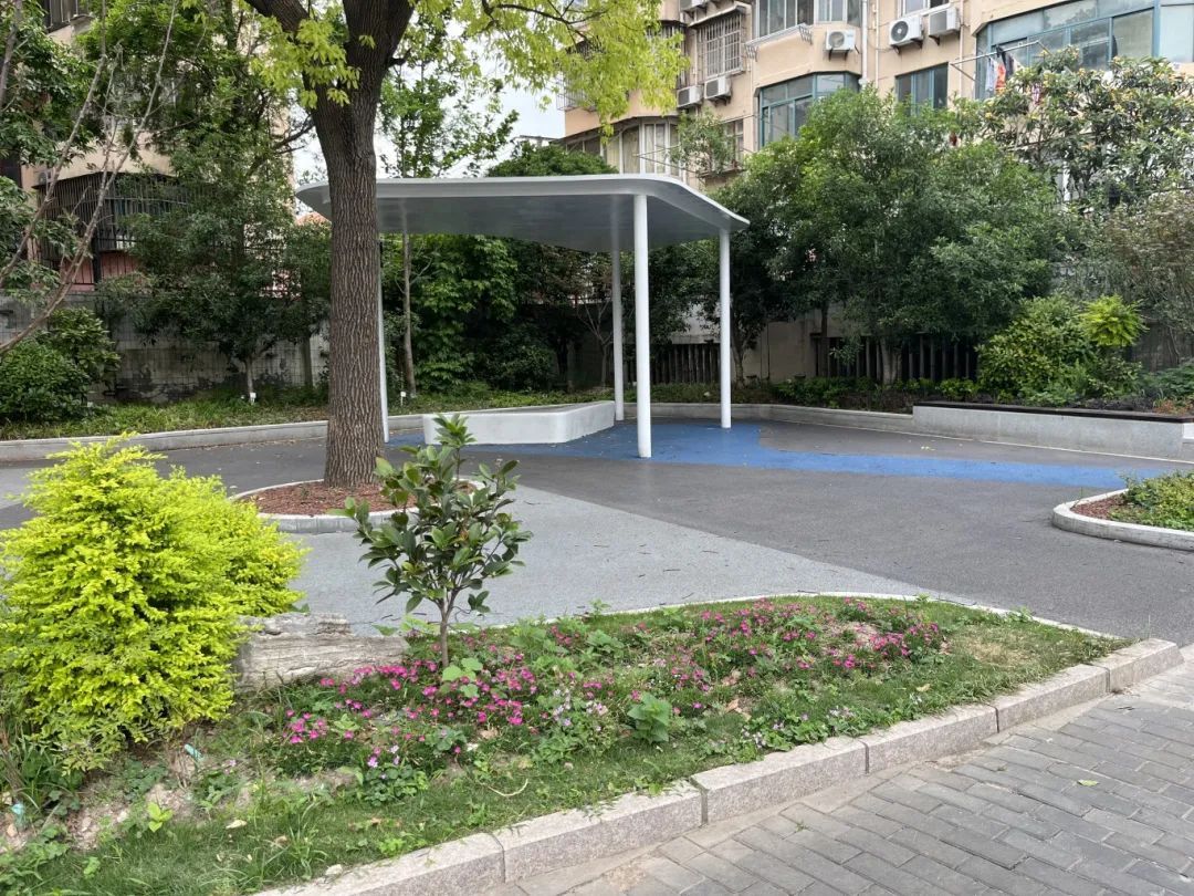 改造前的街角绿地因建设年限较长,存在景观设施陈旧、空间布局不合理等问题。本次改造在保留原有乔木的基础上,对场地进行系统性升级:拆除旧式木廊架和景墙,代之以现代钢架构廊架;新增红枫、南天竹等彩叶植物与花叶玉簪等特色植被,形成层次分明的植物群落;地面铺装全面更换为透水混凝土,既提升步行舒适度又增强海绵城市功能。 区绿化建管中心建设管理科科长表示:“把里面比较老的廊架进行拆除重建,下面的坐凳挡墙进行翻新,包括植物和地被这些园林绿化景观也进行了改造和提升。”