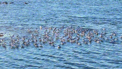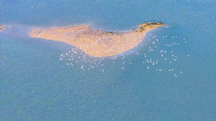 在金色沙滩与蔚蓝海水的映衬下,成群的反嘴鹬时而低空掠过水面,黑白相间的羽翼在阳光下闪烁银光;时而悬停在空中,精准定位水中的美食,优雅地降落在浅滩。