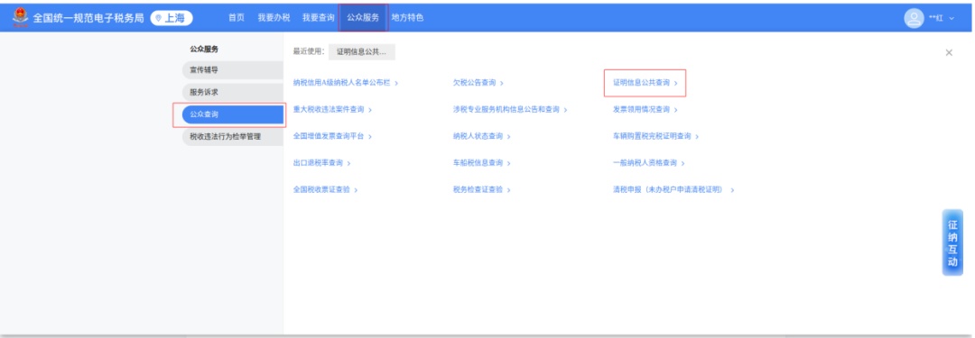 通过企业业务或者自然人业务入口登录电子税务局,点击页面上方【公众服务】-【公众查询】-【证明信息公共查询】功能。