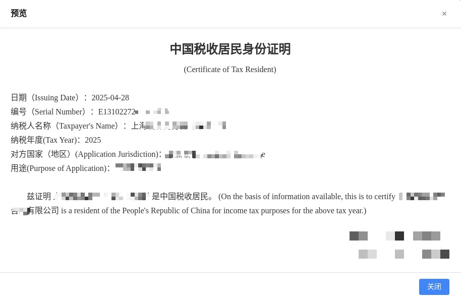 查询到对应的《税收居民证明》后点击查看,即可进入预览界面。