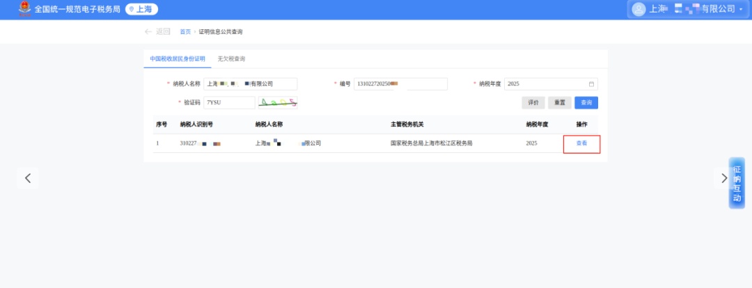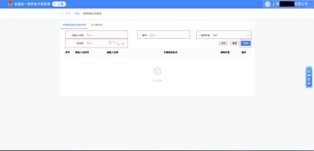 填写要查验的《税收居民证明》的三项必要信息:纳税人名称、编号、纳税年度,填写验证码后点击【查询】。