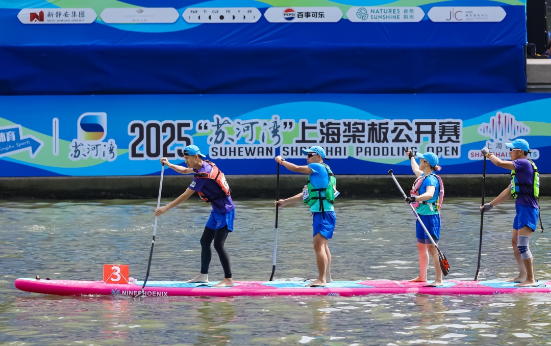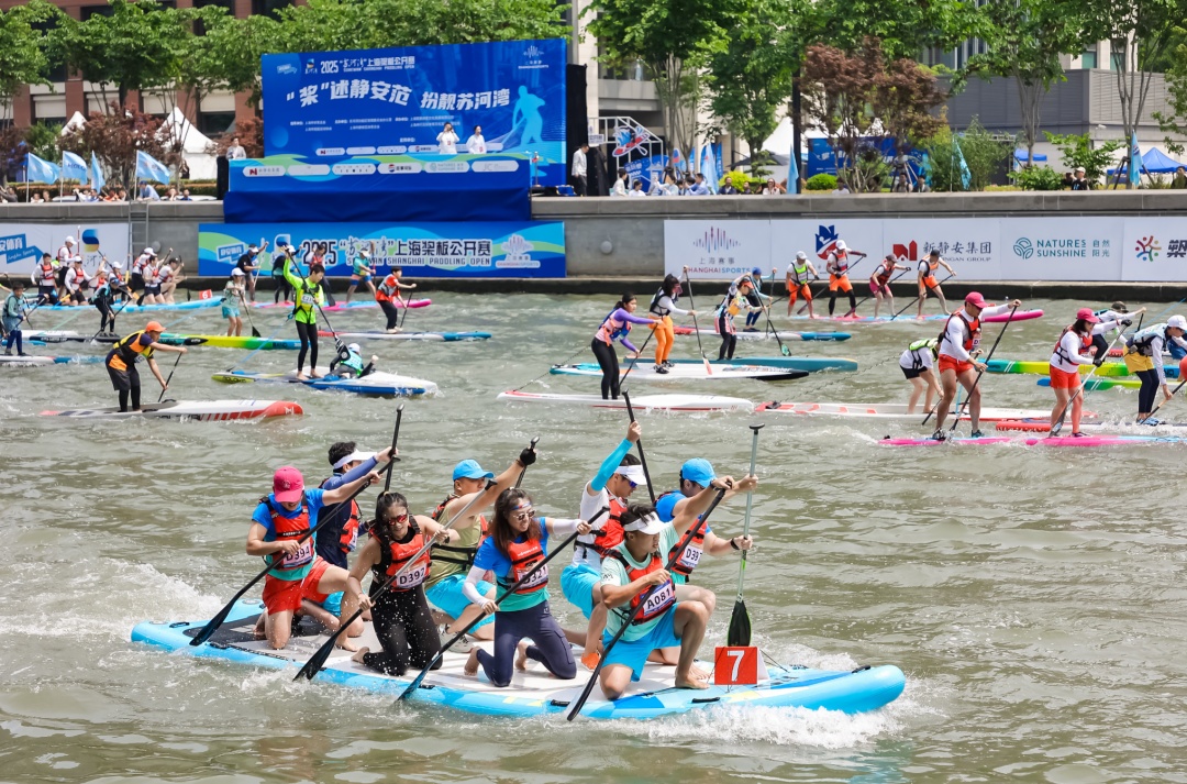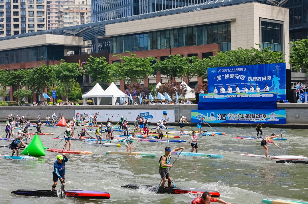 首日赛场,五彩斑斓的桨板在蓝天碧水间一字排开,随着发令汽笛响起,选手们挥桨向前。一人、一桨、一板,静谧的苏州河也随之“动”了起来。